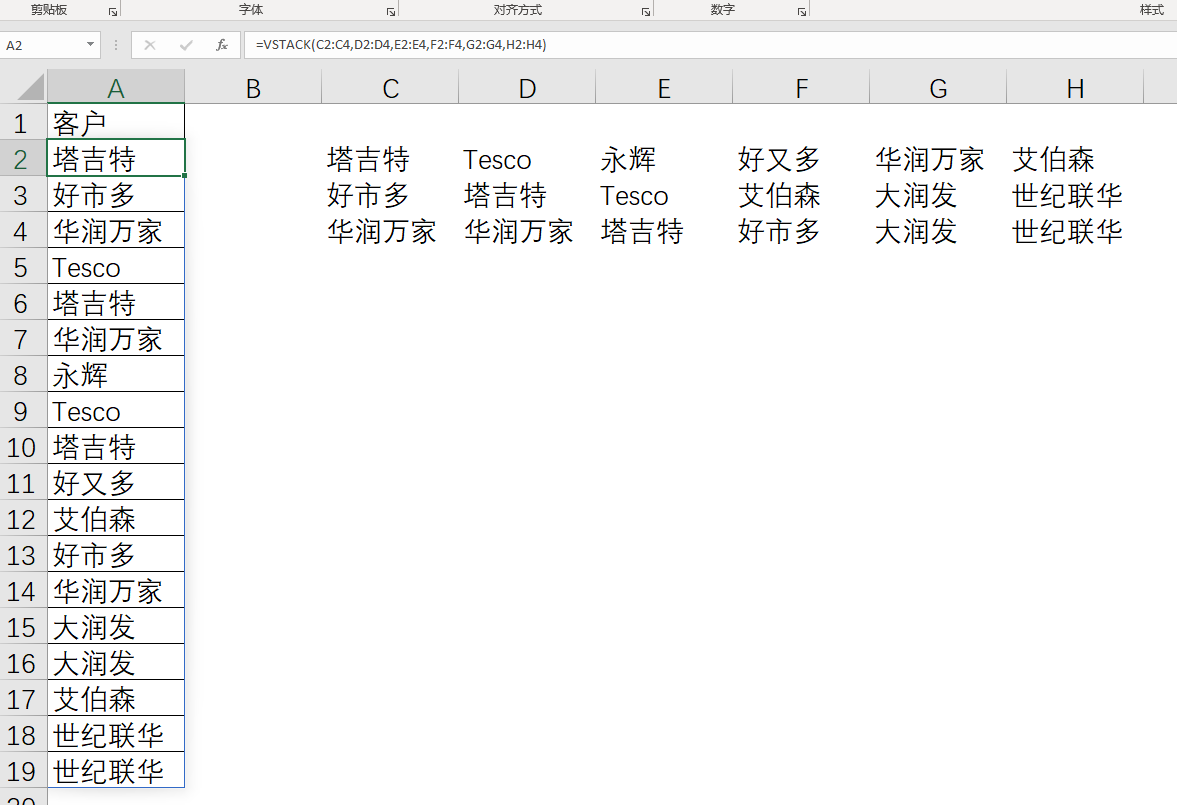8、多列合成1列:VSTACK 图8:=VSTACK(C2:C4,D2:D4,E2:E4,F2:F4,G2:G4,H2:H4)