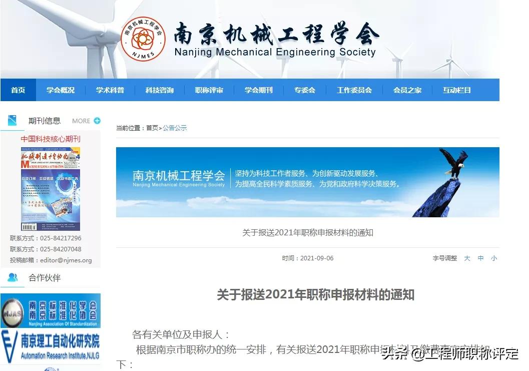 凡通过 2021 年职称申报评审前公示的申报人员,请携带《专 业技术职称资格申报表》(初级/中级一式两份,高级一式三份)和发表的论文期刊、学历证书、继续教育佐证材料等原件备查,于 9 月 10 日至 9 月 30 日期间(工作日上午 9:00-12:00,下午 14:00-16:30)报送至南京机械工程学会审验并缴费,逾期不予受理(未缴费者不能参加评审)。
