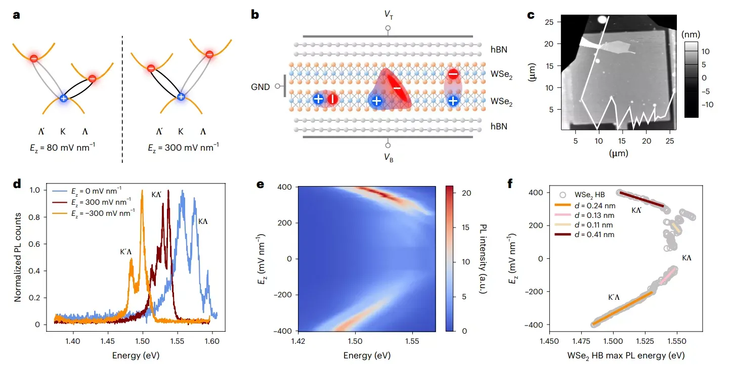近日,瑞士 洛桑联邦理工学院(École Polytechnique Fédérale de Lausanne)Fedele Tagarelli, Edoardo Lopriore,Andras Kis等,在Nature Photonics上发文,利用外加垂直电场,调制范德瓦尔斯异质(WSe2 (HQ Graphene厂商)- hBN)结构中杂化层间激子和量子多体相互作用。实验时空分辨测量了具有不同杂化程度激子的偶极相关性质和输运。