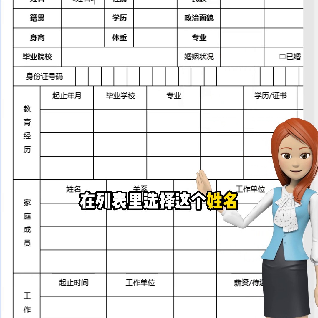 首先把员工资料表保存成默认格式,再根据员工资料制作一个空白的档案表模板。接着点击上方邮件选项卡,再点击选择收件人,在下拉列表里选择这个使用现有列表,找到刚才保存的员工信息表,再点击打开,最后点击确定。接下来把光标定位在姓名这一格里。