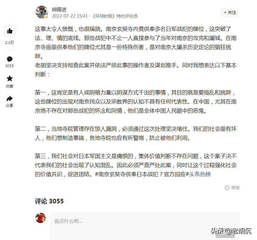 2022-07-22 15:41·《环球时报》特约评论员胡锡进头条发文,病句修改如下:
