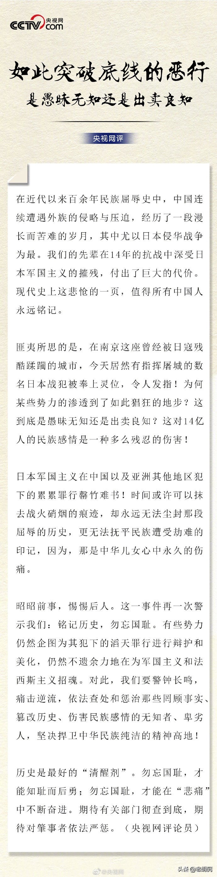 4,第三,我们社会对日本军国主义是痛恨的,集体价值判断不存在问题,这个案子决不代表我们的社会出现了认知混乱。因此必须严查严处此案,同时让这个过程强化社会的价值共识,促进团结。