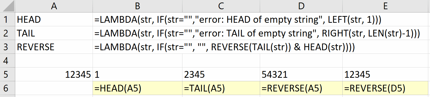 4.2、递归反转字符串,这在以前超出了Excel内置公式,只能使用VB/VBA或JavaScript在公式语言之外编写。但现在不必了,下例中将REVERSE定义为递归LAMBDA,它利用几个辅助函数(HEAD和TAIL)分别计算第一个字符和除第一个字符以外的所有字符。