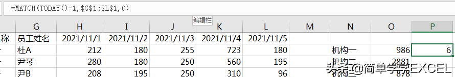 在Offset中加入Match函数来匹配日期,用Match返回值取代偏移列即可。公式:SUMIFS(OFFSET($F$1,1,MATCH(TODAY()-1,$G$1:$L$1,0),20,1),$F$2:$F$21,N2)。释义:TODAY()-1是指前一天,在$G$1:$L$1这个区域查找前一天的日期,找到后,返回1个数字,为在区域$G$1:$L$1中的位序数,图4中情况返回的是6(见图5)。偏移的列会随日期变化而变化,SUMIFS求和的区域也会随日期变化,从而实现Sumifs对动态区域求和。