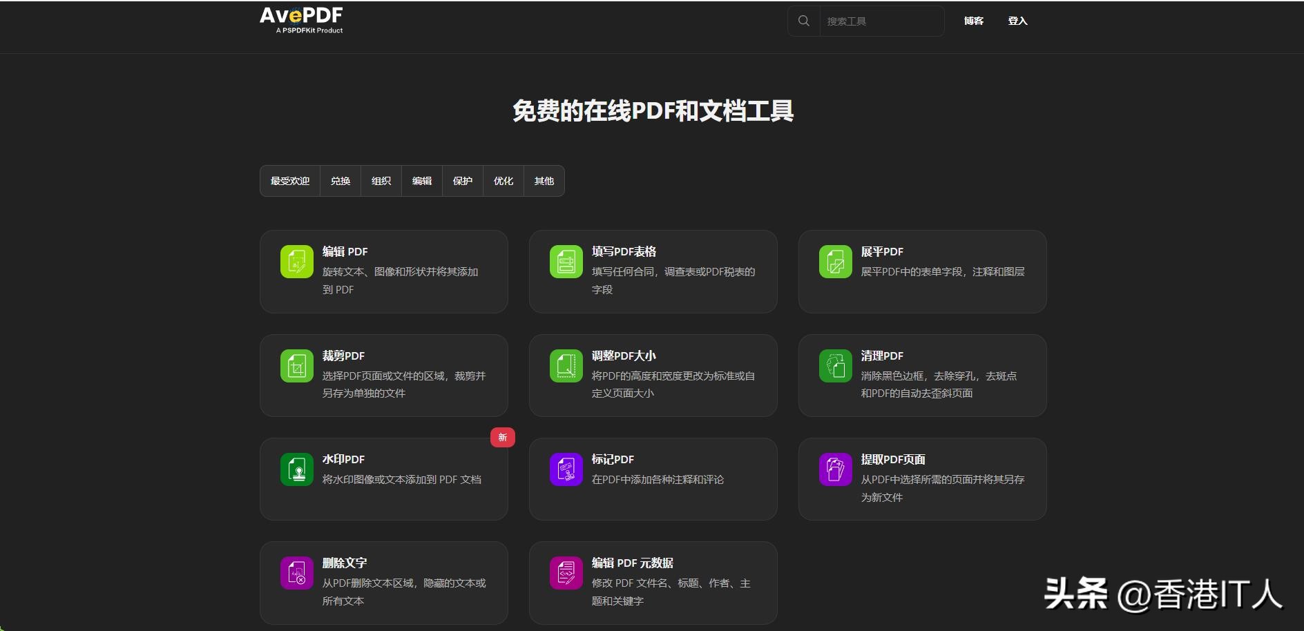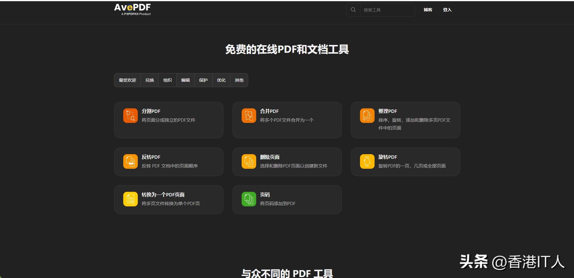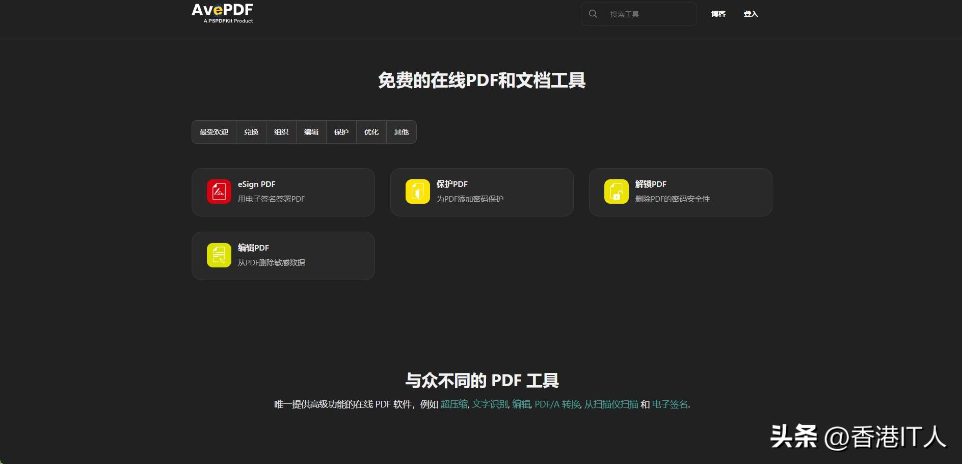 这个网站提供深色模式,还支持中文及其他语言 (见网页底部),不用担心看不懂的问题。共有七大分类工具,分别是最受欢迎、兑换、组织、编辑、保护、优化和其他。
