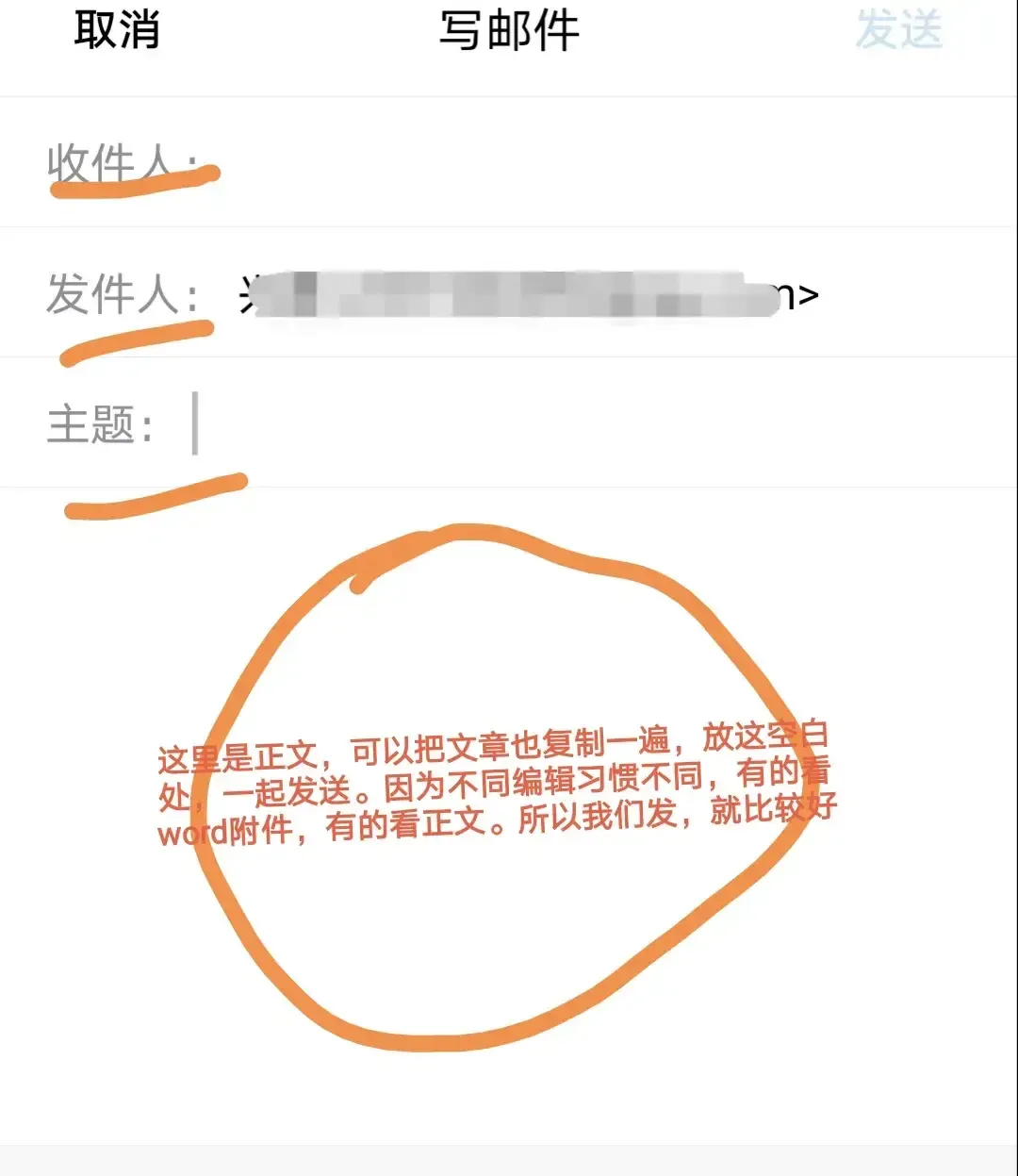 •然后【把文章粘贴到邮箱正文处】,点发送,发送完毕,投稿流程就完成了。