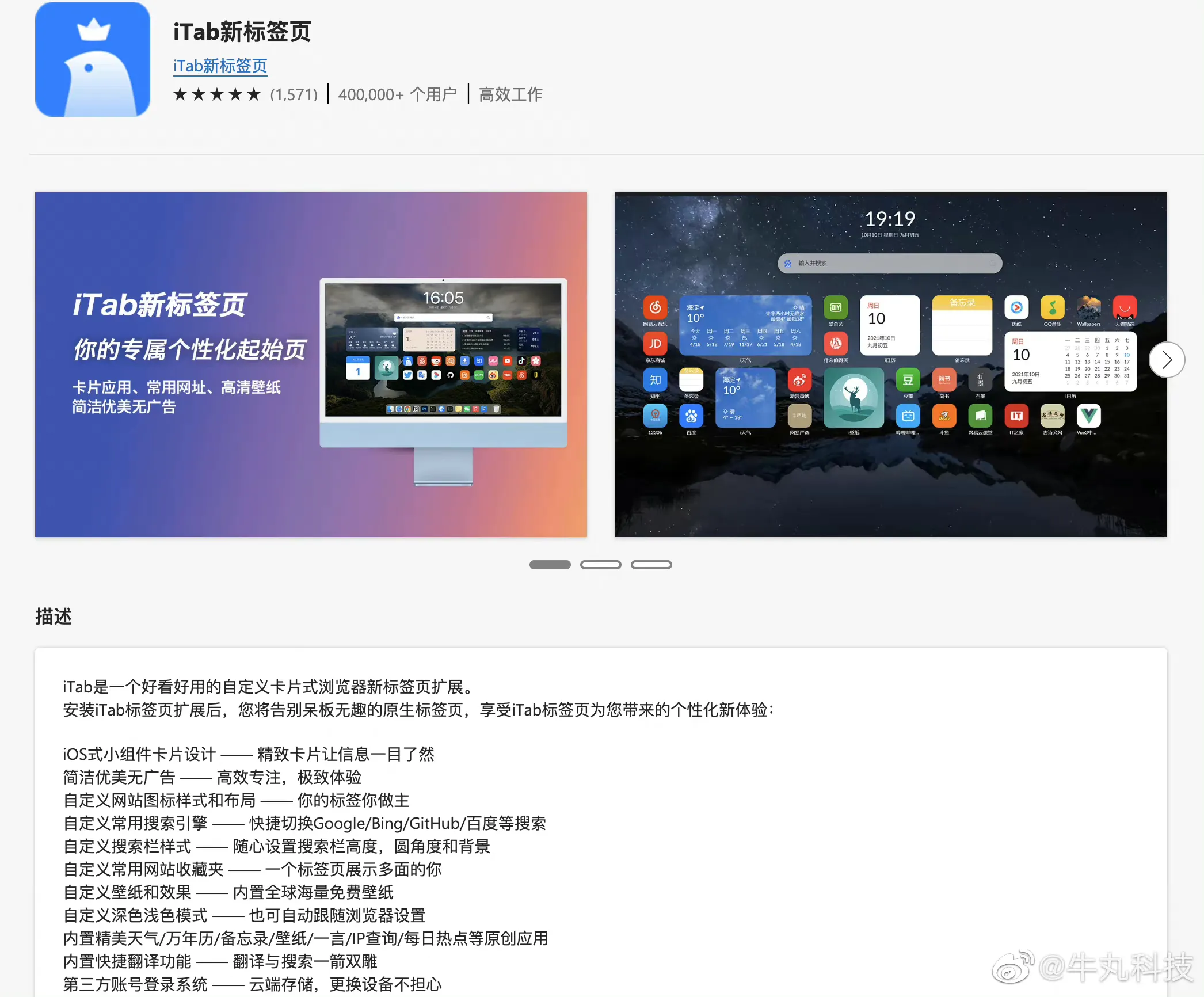 3、iTab新标签页:非常好看好用的浏览器新标签页扩展,而且是以卡片的形式展现。它集合全网开源高清壁纸、内置iOS式小组件原创应用、响应式天气、今日热搜、待办事项、万年历、搜索框快捷翻译英文等功能。喜欢动手的小伙伴 ,完全可以打造一个专属于自己的个性化浏览器主页。