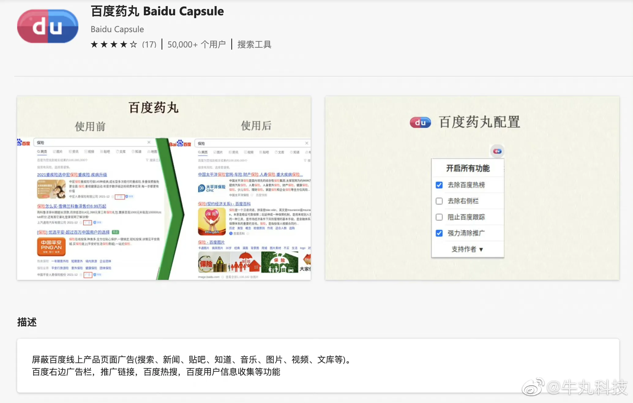 5、百度药丸Baidu Capsule:屏蔽百度线上产品页面广告(搜索、新闻、贴吧、知道、音乐、图片、视频、文库等),不用多说,必须安装,还你一个干净的搜索结果。