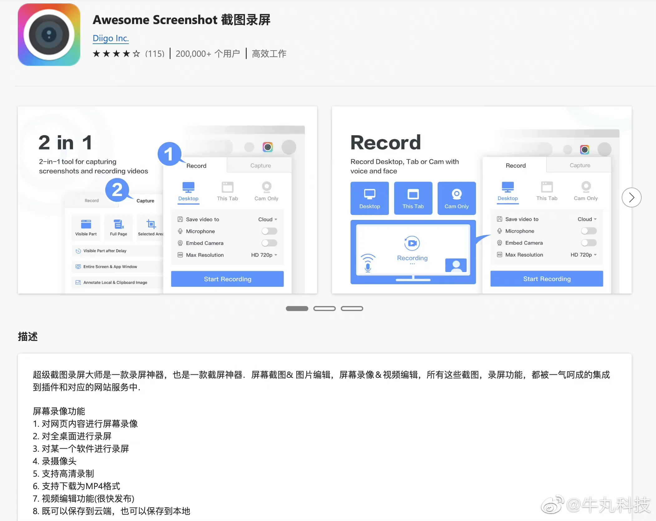 2、Awesome Screenshot 截图录屏:它是一款截图、录屏神器!截图可以截取整个网页的长图、可视区域、选择区域。录屏不仅可以录制浏览器,还可以选择窗口录制,甚至可以录制桌面和摄像头。日常搞视频需要一些网页素材,可以直接录屏。