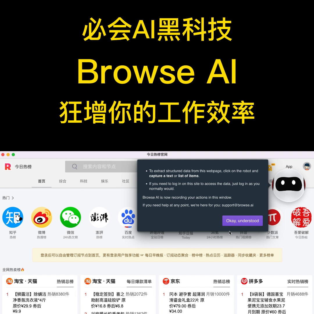 今年如果你只听说过ChatGPT,评论回复获取链接,那是远远的不够。今天要介绍一款令人难以置信的工具,那就是Browse Al。它是可以做到自动化网页浏览,并能及时数据分析的工具。简单的理解就是,它能够自动抓取网页上的数据,并帮你整理成想要的格式。更多的是通过工程师写一个爬虫程序,来获取这些信息。但对于绝大多数普通人来说,去学习编程的成本是非常高的,而这款工具却能轻松帮我们实现。