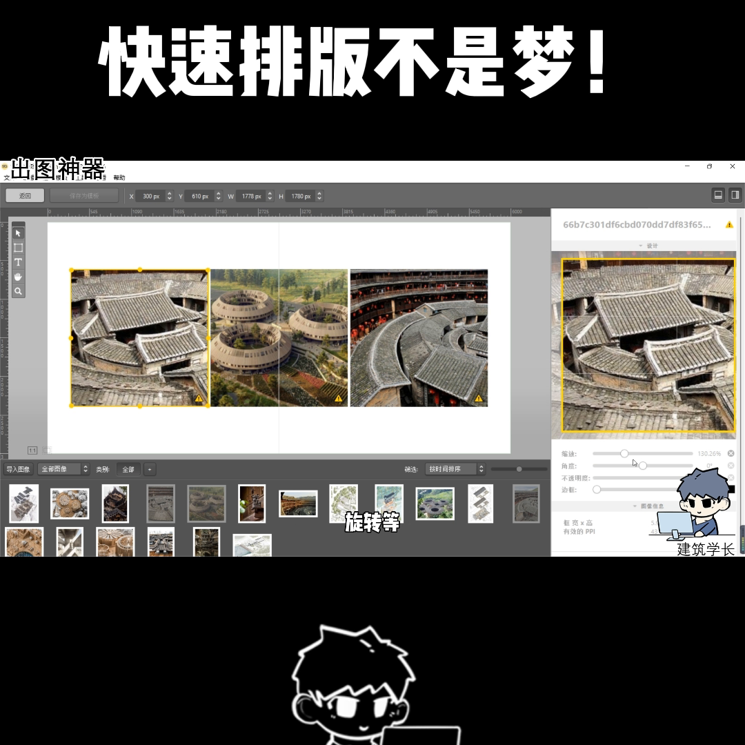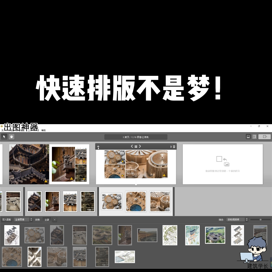 进入界面后先导入图片,菜单栏的文件可以导入图片,也可以选导入或者直接拖拽进去。全选图片拖拽进图像库。选中图片拖到文档中,上方有多种版式可以选择。