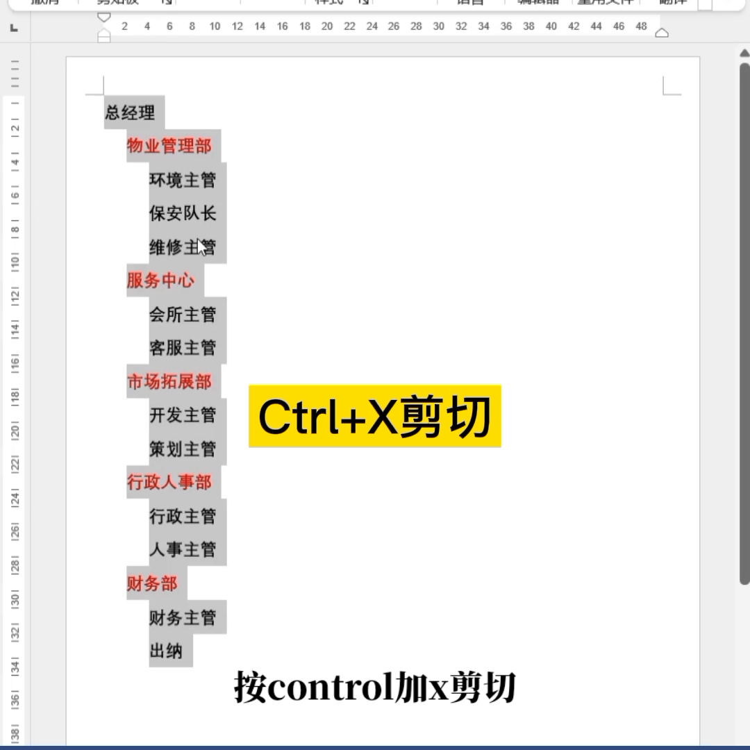 word文档中如何制作组织架构图?像这样简洁明了的公司组织架构图,你知道怎么做吗?很简单,我们先将所有组织名称按顺序录入到表格中,再通过敲tab键来调整组织层级。总经理作为第一集不用敲tab键。再按住control键,选中第二集所有组织名称,敲一次tab键,选中所有第三集名称,敲两次tab键,所有的组织名称就区分好层级了。