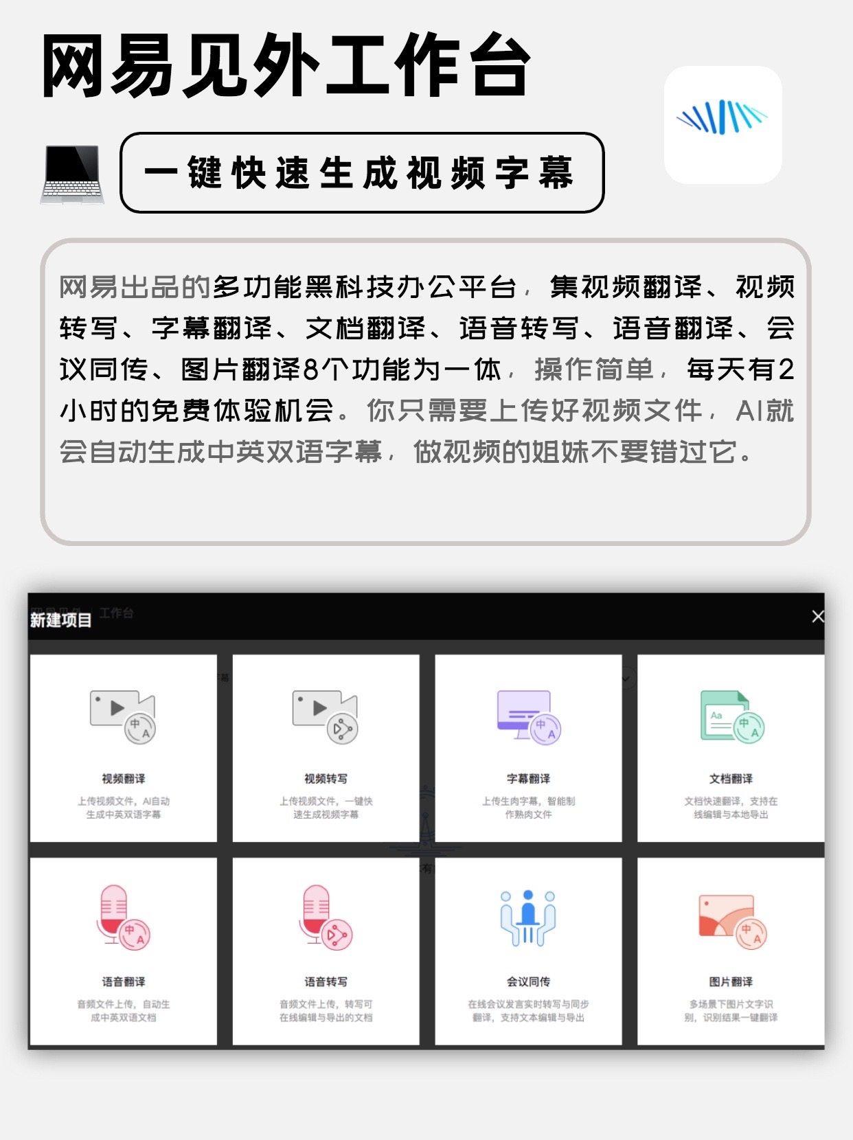 集视频翻译、视频转写、字幕翻译、文档翻译、语音转写、语音翻译、会议同传、图片翻译8个功能为一体,每天有2小时的免费体验机会~