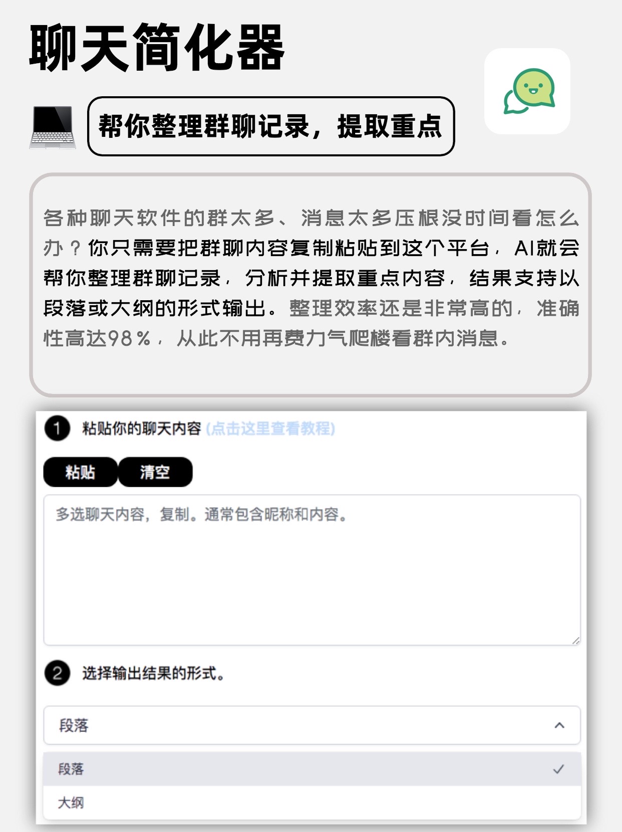 帮你整理群聊记录,并提取重点内容,准确性高达98%