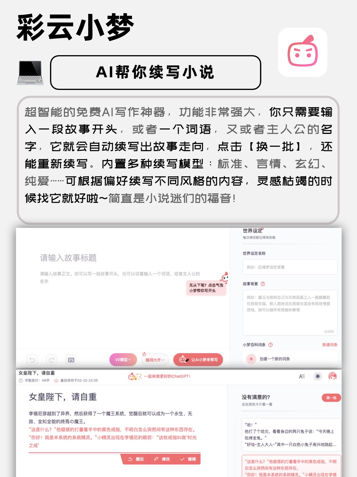 Ai帮你写小说,只需要输入一段故事开头,或者一个词语,又或者主人公的名字,它就会续写不同风格的内容,灵感枯竭的时候找它就好啦~