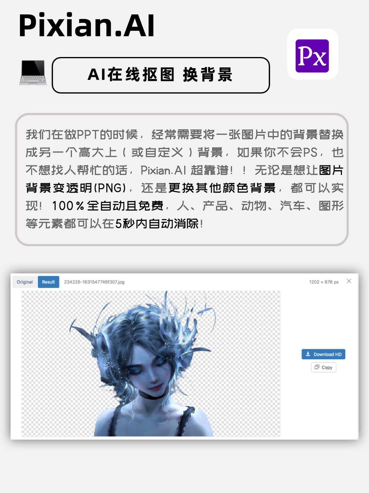 只需上传图像,5秒钟即可完成在线抠图,背景更换