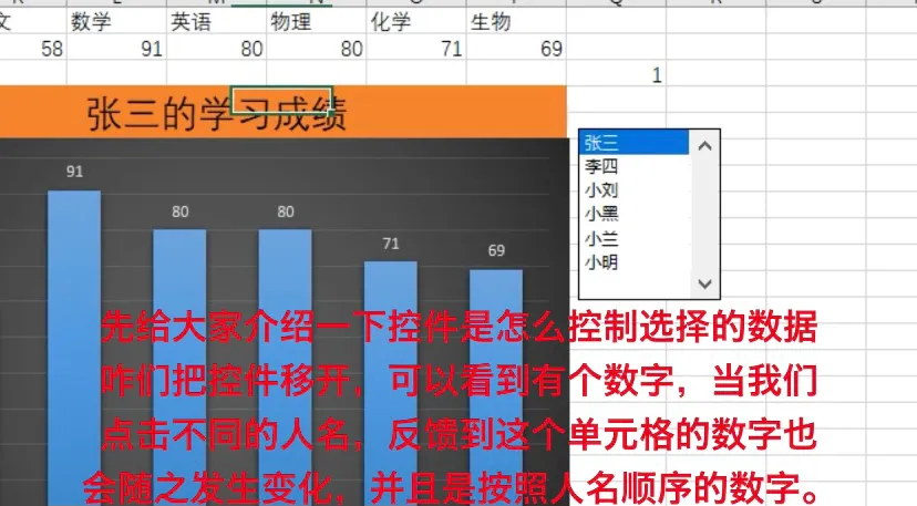 先给大家介绍一下控件是怎么控制选择的数据,咋们把控件移开,可以看到有个数字,当我们点击不同的人名,反馈到这个单元格的数字也会随之发生变化,并且是按照人名顺序的数字。