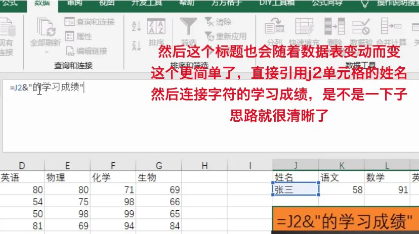 然后这个标题也会随着数据表变动而变,这个更简单了,直接引用j2单元格的姓名,然后连接字符的学习成绩,是不是一下子思路就很清晰了,