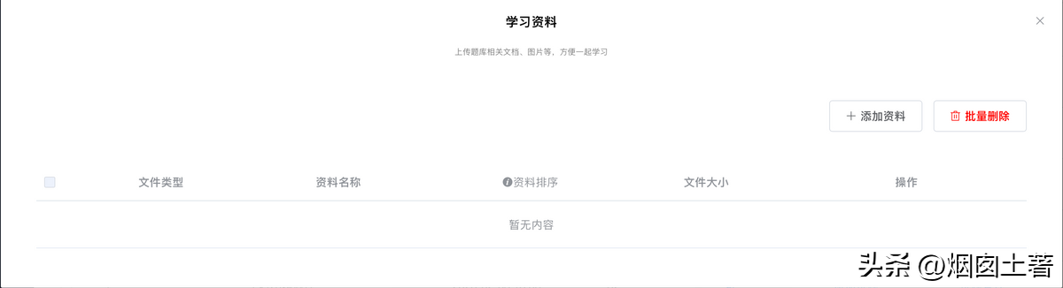 学习资料是为了解决在刷题之外需要了解的资料,比如机构希望学员在刷题之外要知道一些额外的信息,学习资料支持文档、图片。