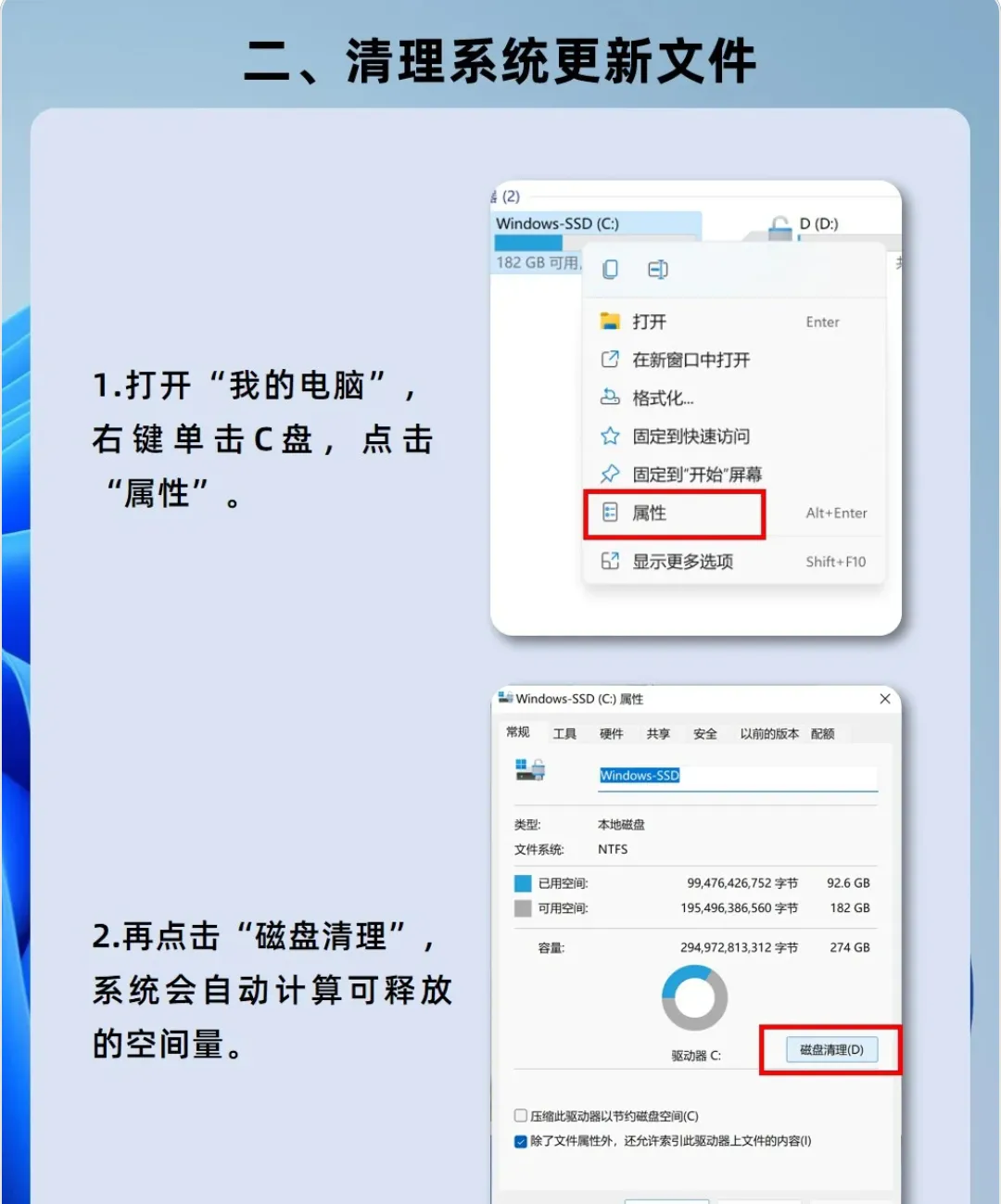 第一步,打开【我的电脑】,右键单击C盘,点击【属性】,再点击【磁盘清理】,接下来系统会自动计算可释放的空间量;