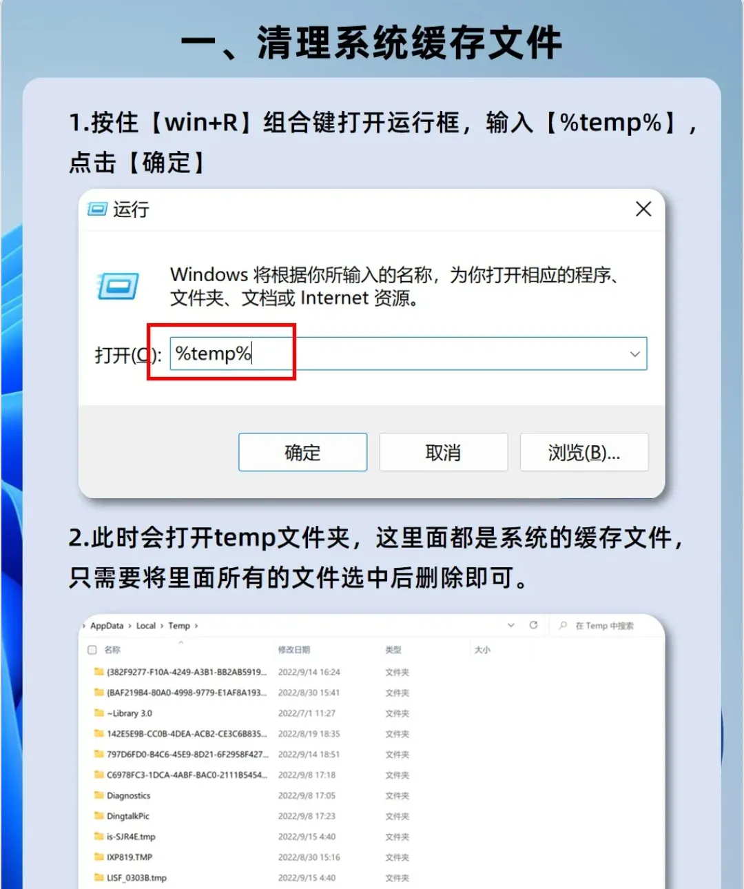 按住【win+R】组合键打开运行框,在弹出的窗口中输入【%temp%】,点击【确定】。此时会打开temp文件夹,这里面都是系统的缓存文件,只需要将里面所有的文件选中后删除即可。第二招,清理系统更新文件