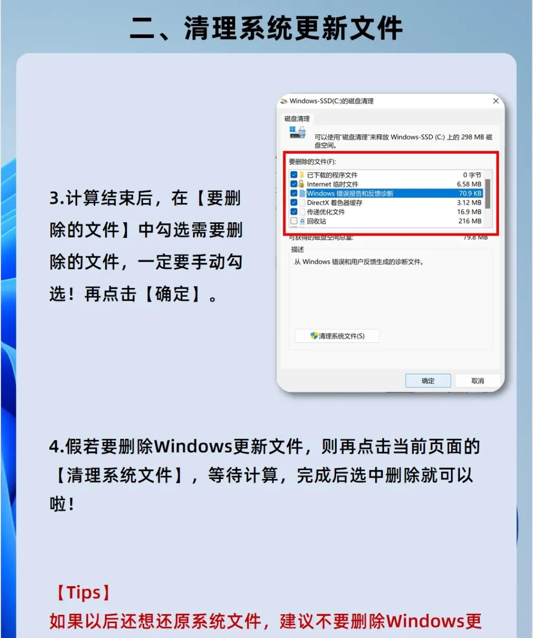 第三步:假若要删除Windows更新文件,则再点击当前页面的【清理系统文件】,等待计算,完成后选中删除就可以啦第三招,关闭系统还原。