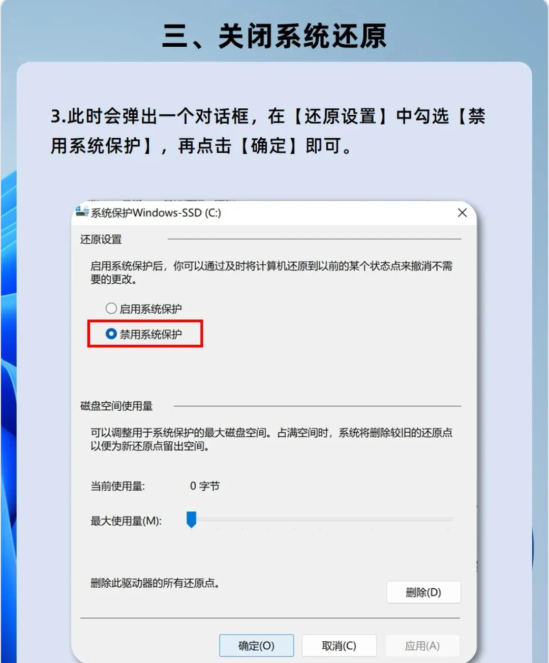 第三步,此时会弹出一个对话框,在【还原设置】中勾选【禁用系统保护】,再点击【确定】即可
