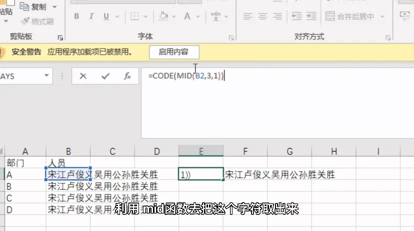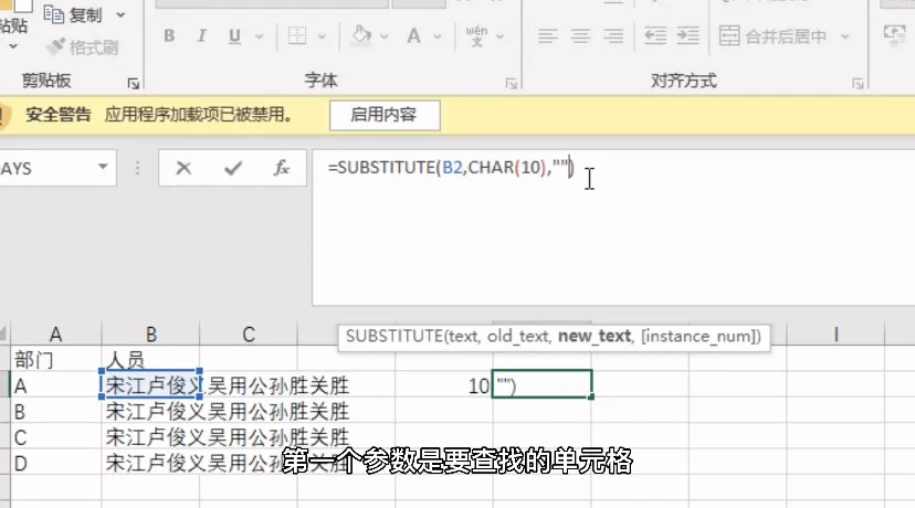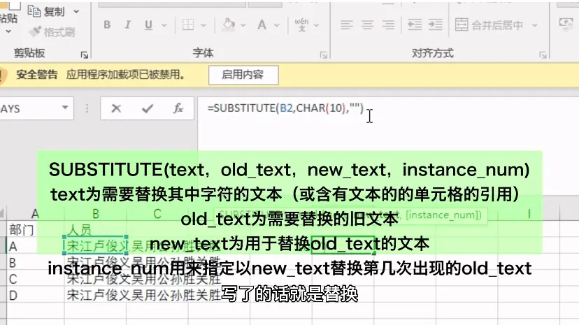 [灵光一闪]第二种办法是先用code去判断字符的编码,利用mid函数去把这个衣服取出来,套一个code,知道了编码以后,咋们用substitute函数,把b2单元格里面的所有这个编码的字符删除。这个函数第一个参数是要查找的单元格,第二个参数是要查找的字符,第三个参数是替换成什么,第四个参数可以不写,写了的话就是替换第几次出现的那个不可见字符,不写就是全部替换。这里咋们想删除编码为10的不可见字符,char就是返回编码对应的字符,然后因为咋们要删除这个不可见字符,所以第三个参数咋们直接输入两个双引号,然后咋们把公式复制粘贴为值可以看到,所有的换行符都被删除了!