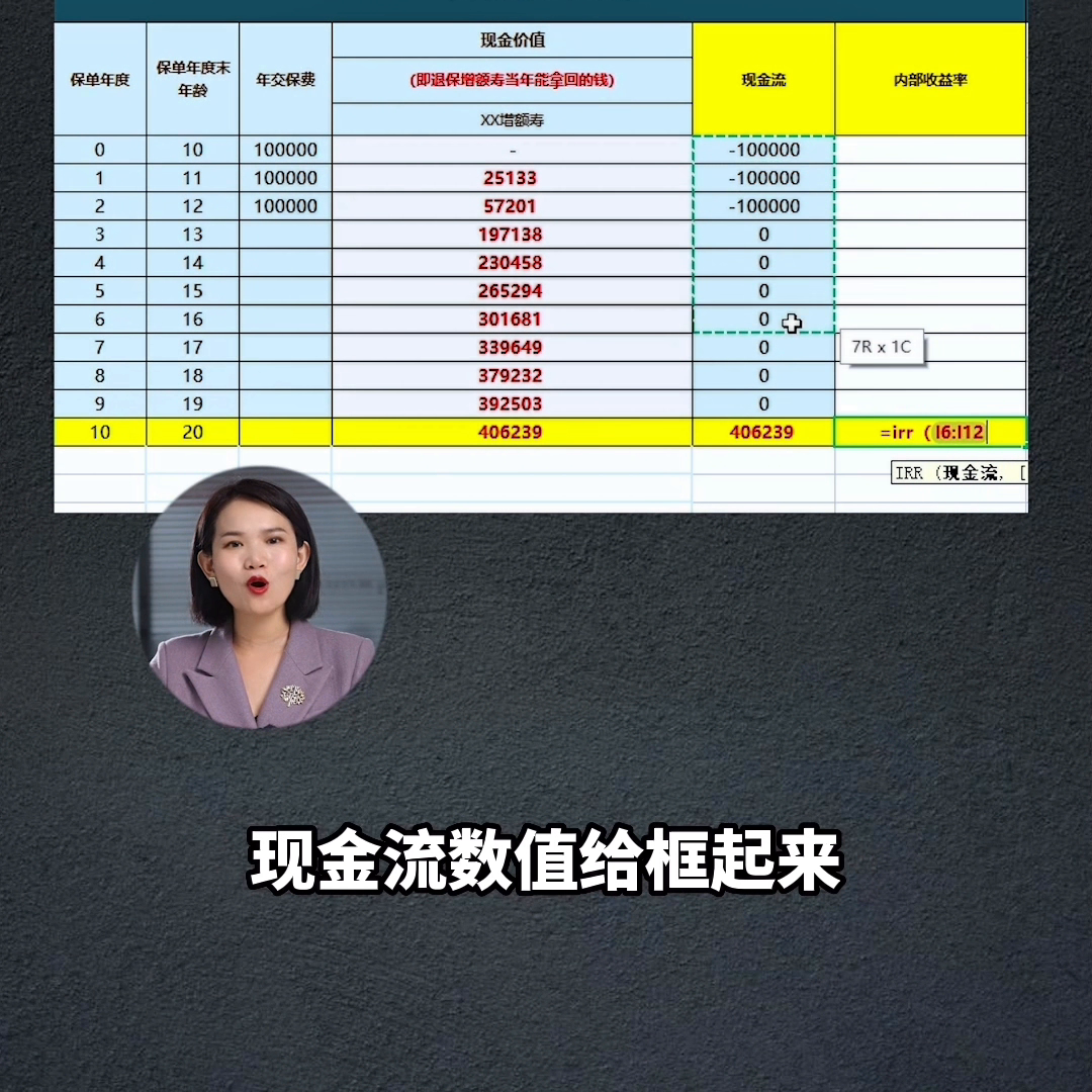 大家只需要用一张excel表,把每年的现金流列出来就可以,这个要注意列现金流的时候保单年度一定要从零年开始,就像刚出生的宝宝,一出生的时候是零岁,然后前三年需要每年交十万进去,所以现金流就是负债之后不交也不取,所以现金流是零。