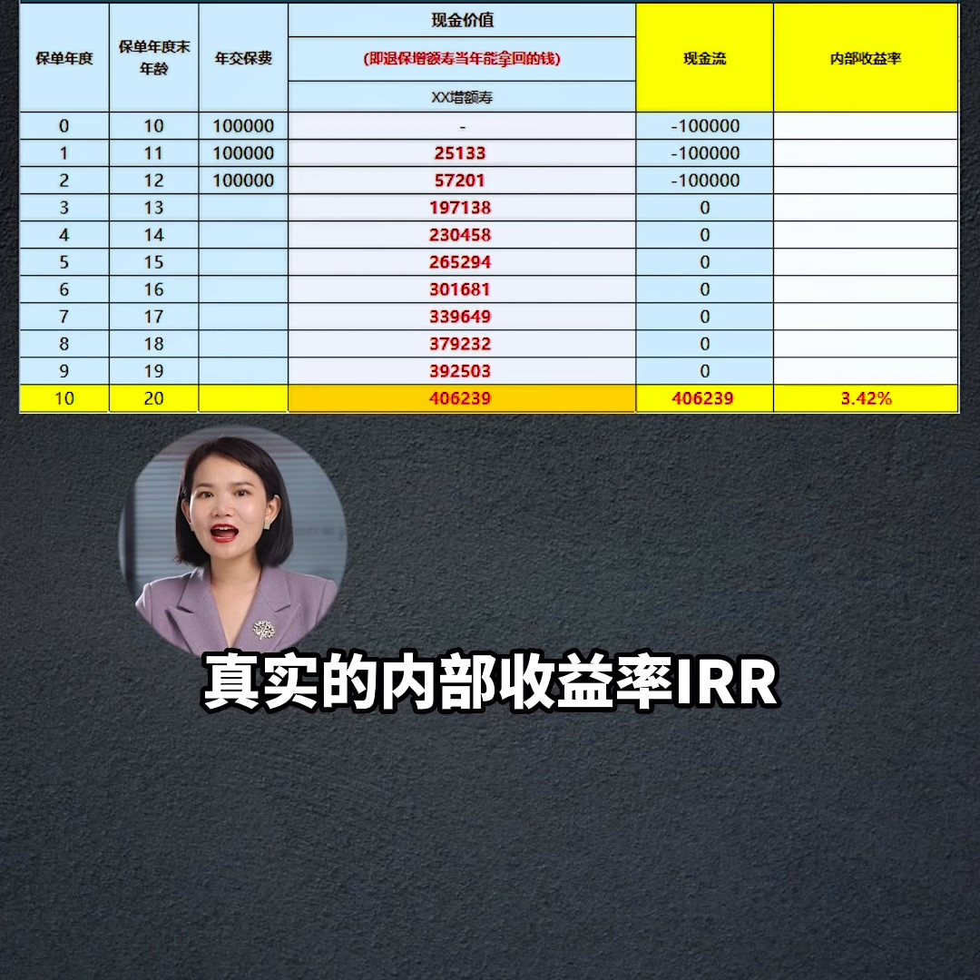 假设一个十岁的男孩每年交十万,交三年,总共是交了三十万现金价值表就是每年能够领到的钱,十年之后账户增值到了四十万六千两百三十九,真实的内部收益率达到了百分之三点四二,这是怎么算出来的?非常简单。