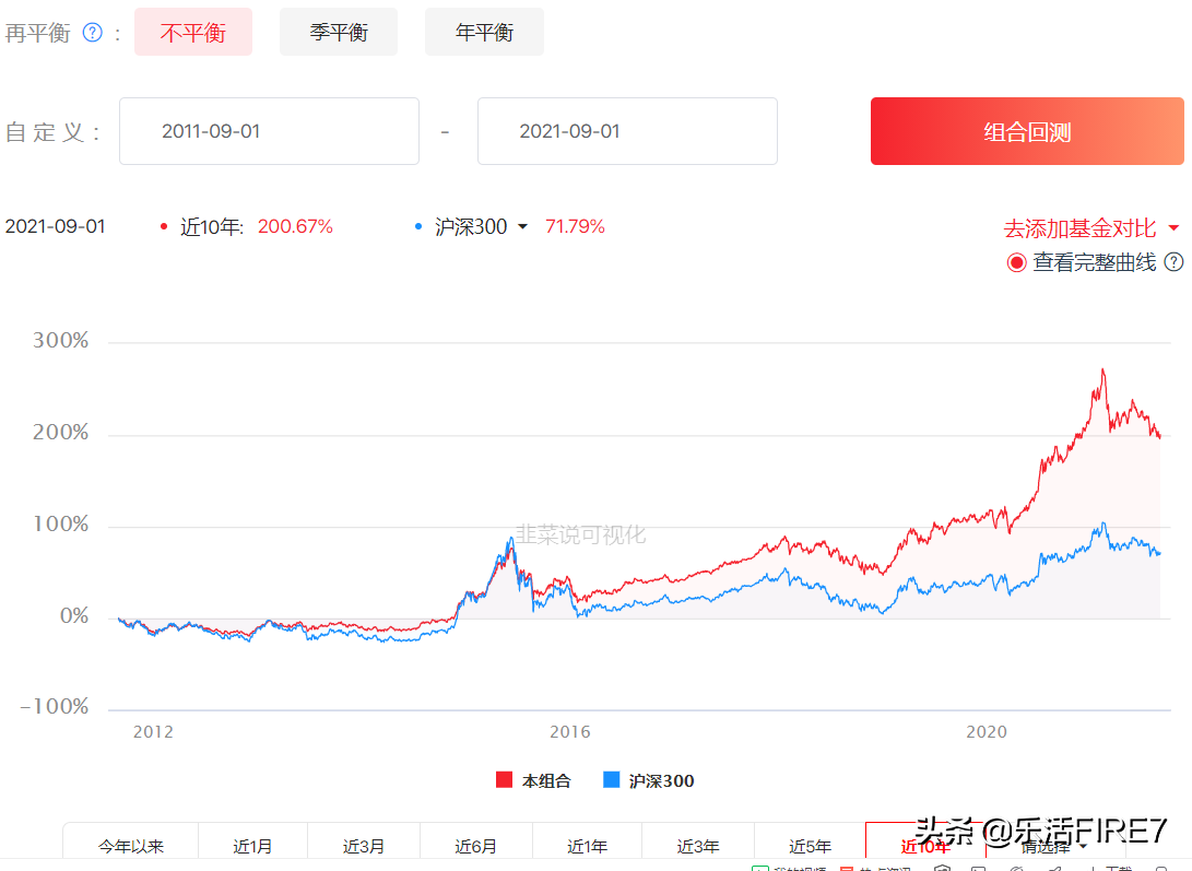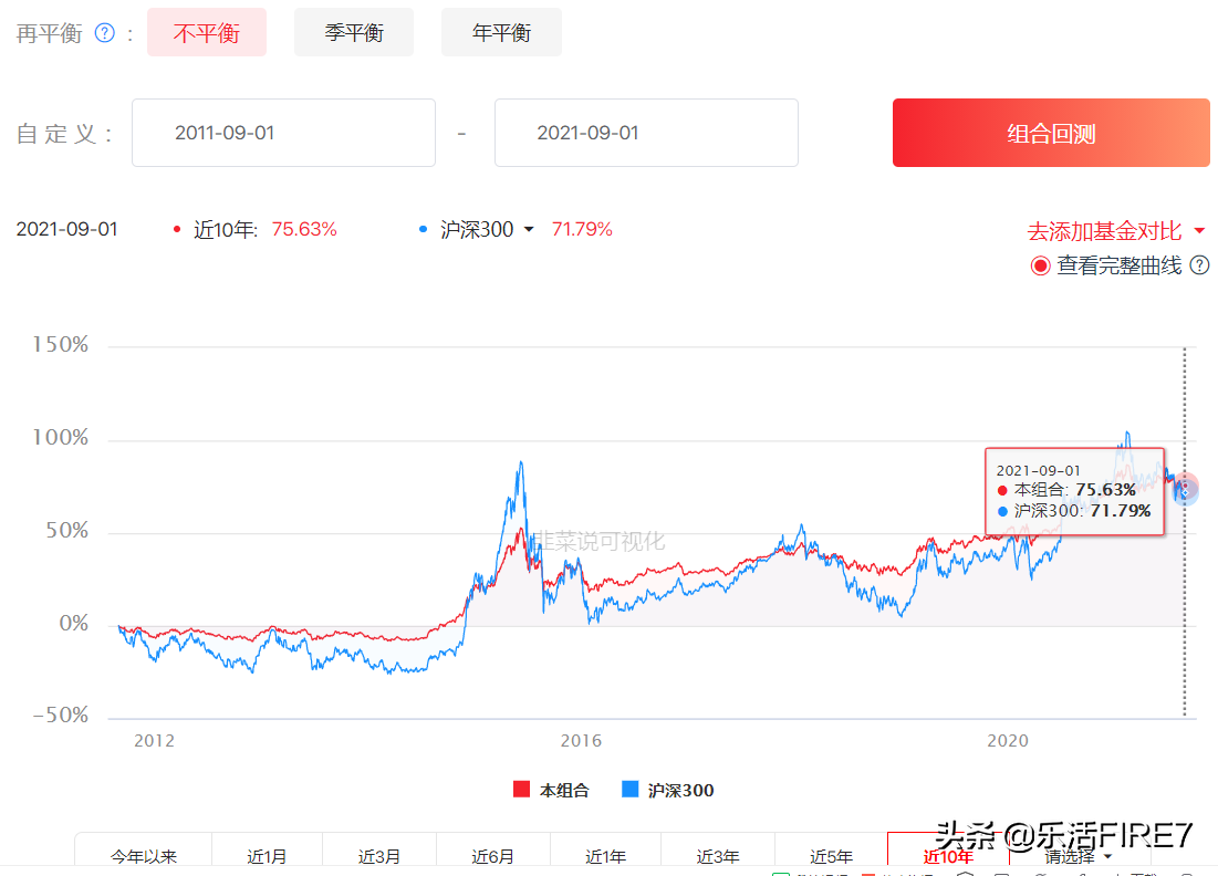 第一个账户不用太多说明,在余额宝里面一年最多给你产生一顿饭钱,主要从第二个账户开始,按照股债如上配置后,我用60%工银纯债债券A+40%易方达沪深300ETF连接A来做回测,大家可以看到10年的年化在7.56%,假设在此基础上打7折,也就约等于年化5.3%,也就是说大概这个账户的钱要取完,需要15年以上(具体计算大家自己用EXCEL表算一下就清楚了)。