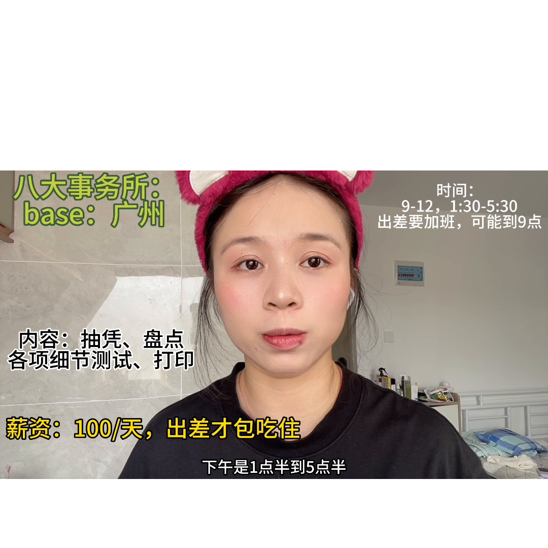 第二点是关于他的薪酬。薪酬是100一天,但如果是出差是包吃住的。出差吃住的内容主要是根据你去盘点,去审计的企业给你的待遇。出差要加班可能到9点,那他的上班时间是上午的9点到12点,下午是1点半到5点半。出差一般情况下要回所里加班,加班可能会加到晚上9点钟。而周末加班的情况,一般是在项目快结束的时候,任务比较多的时候会周末加班。