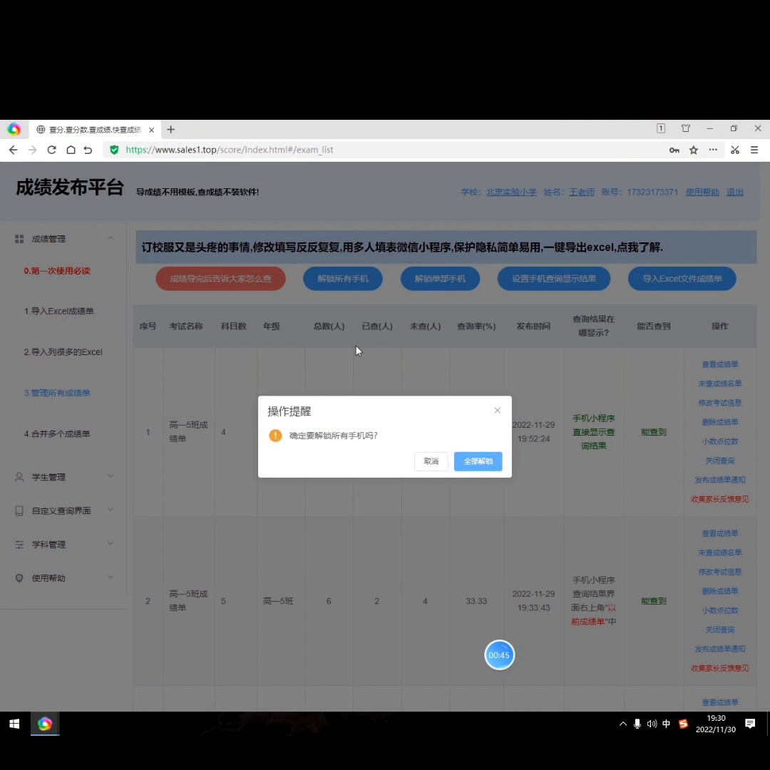 老师可以点击手机解锁这个功能。解锁所有的手机这个功能,须谨慎使用。如果只需要解锁一个,点击解锁单部手机,输入学生的姓名和学号,就可以解锁了。