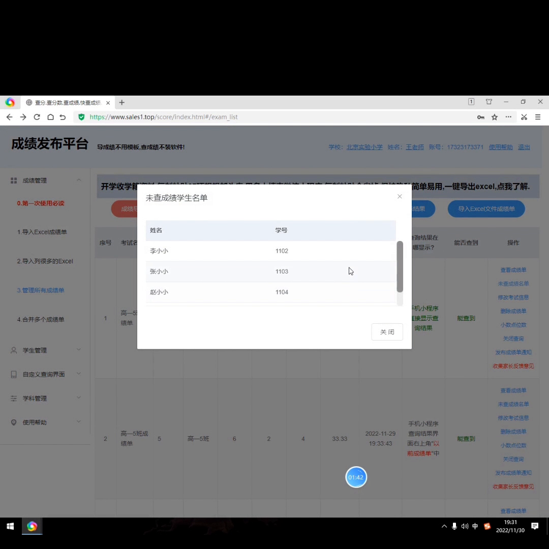 接下来这个功能是导入excel的文件成绩单。接下来我们来看一下右侧的操作功能。第一个是查看成绩单,点击进入可以查看或修改数据。接下来点击未查成绩名单,可以查看哪些学生的成绩还没有被查看。继续点击下一个修改考试信息的选项,可以更改考试名称和年级班级。