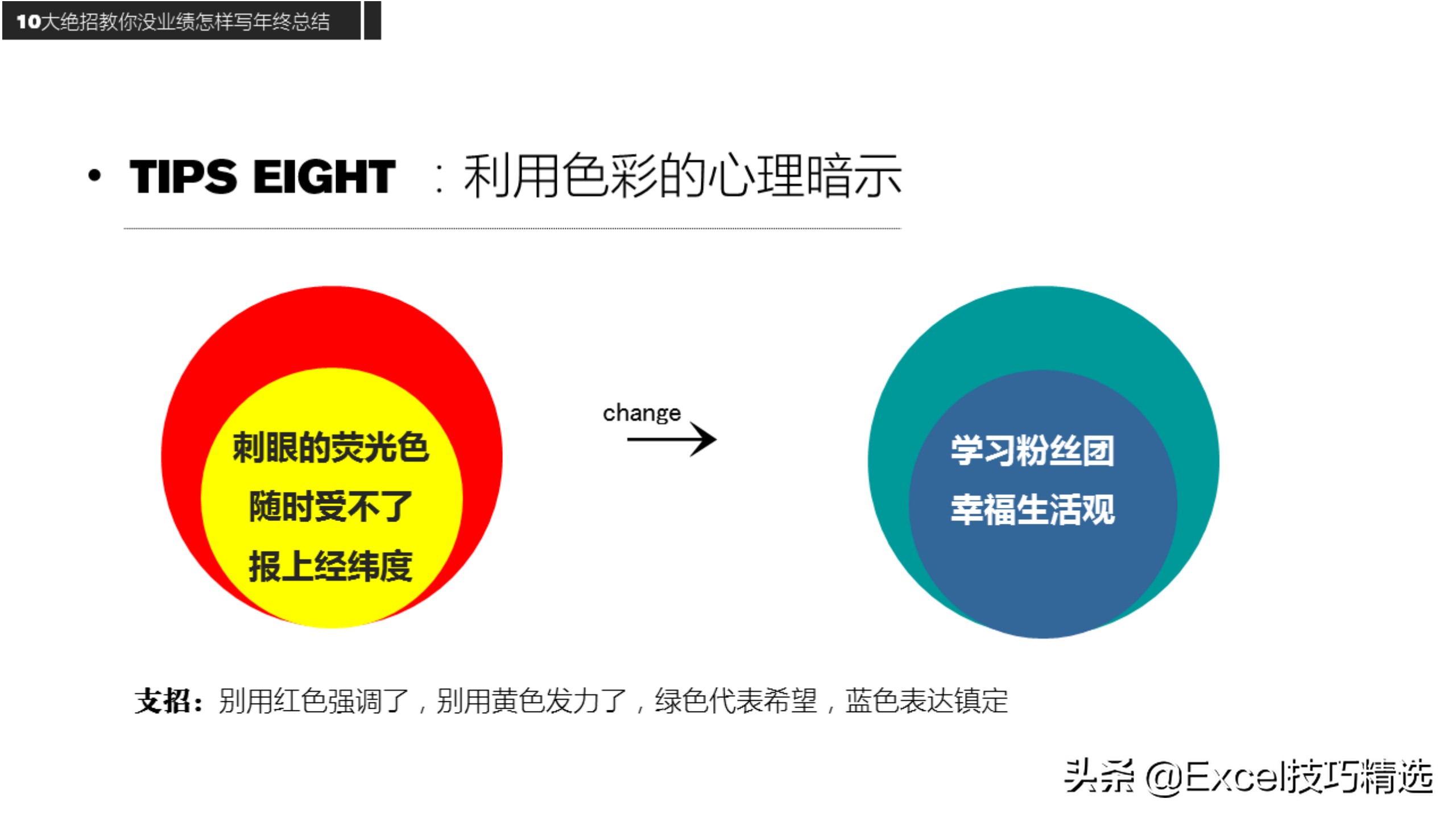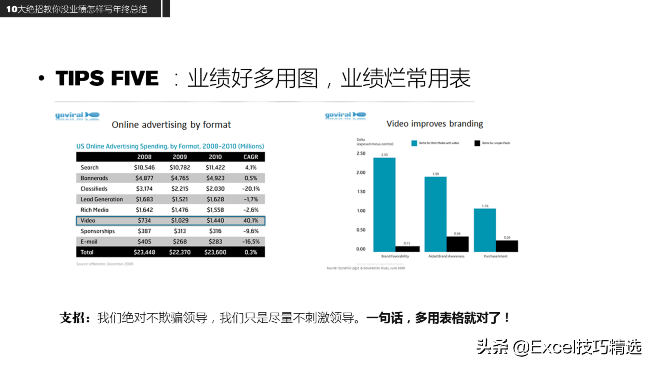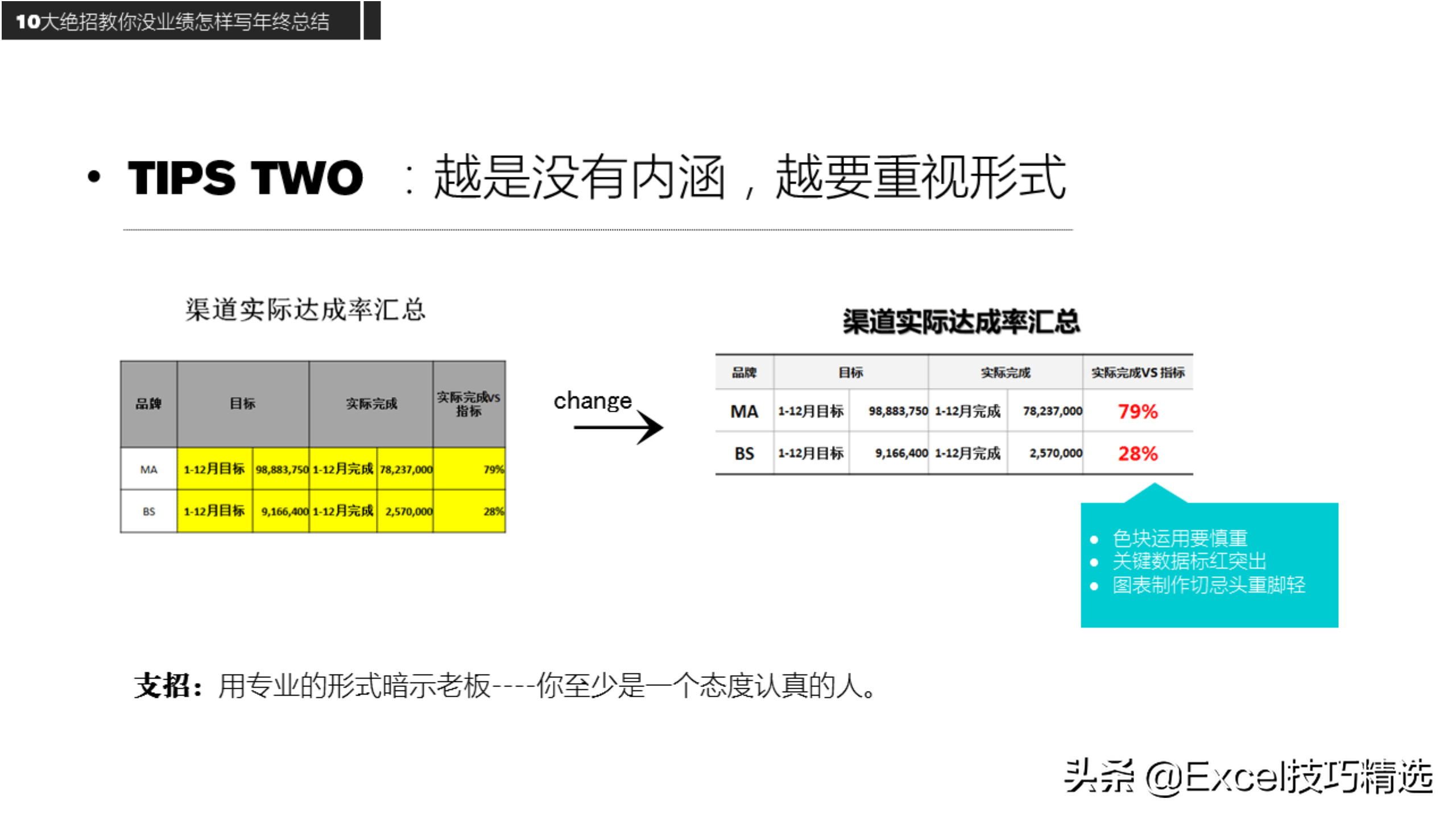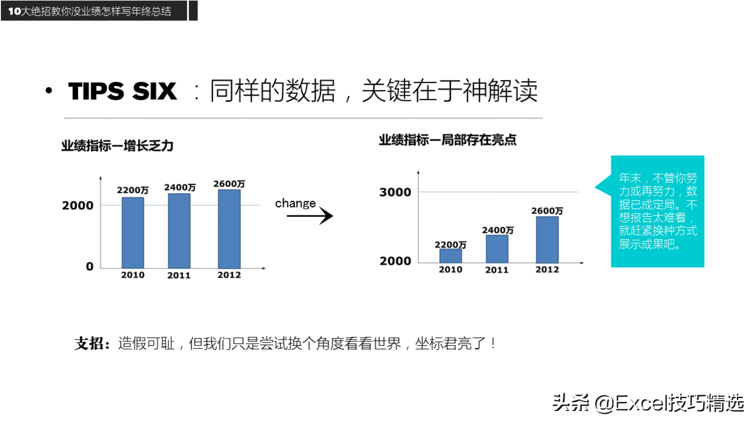 技巧:业绩好多用图,业绩不好则多用表,换个角度而已;