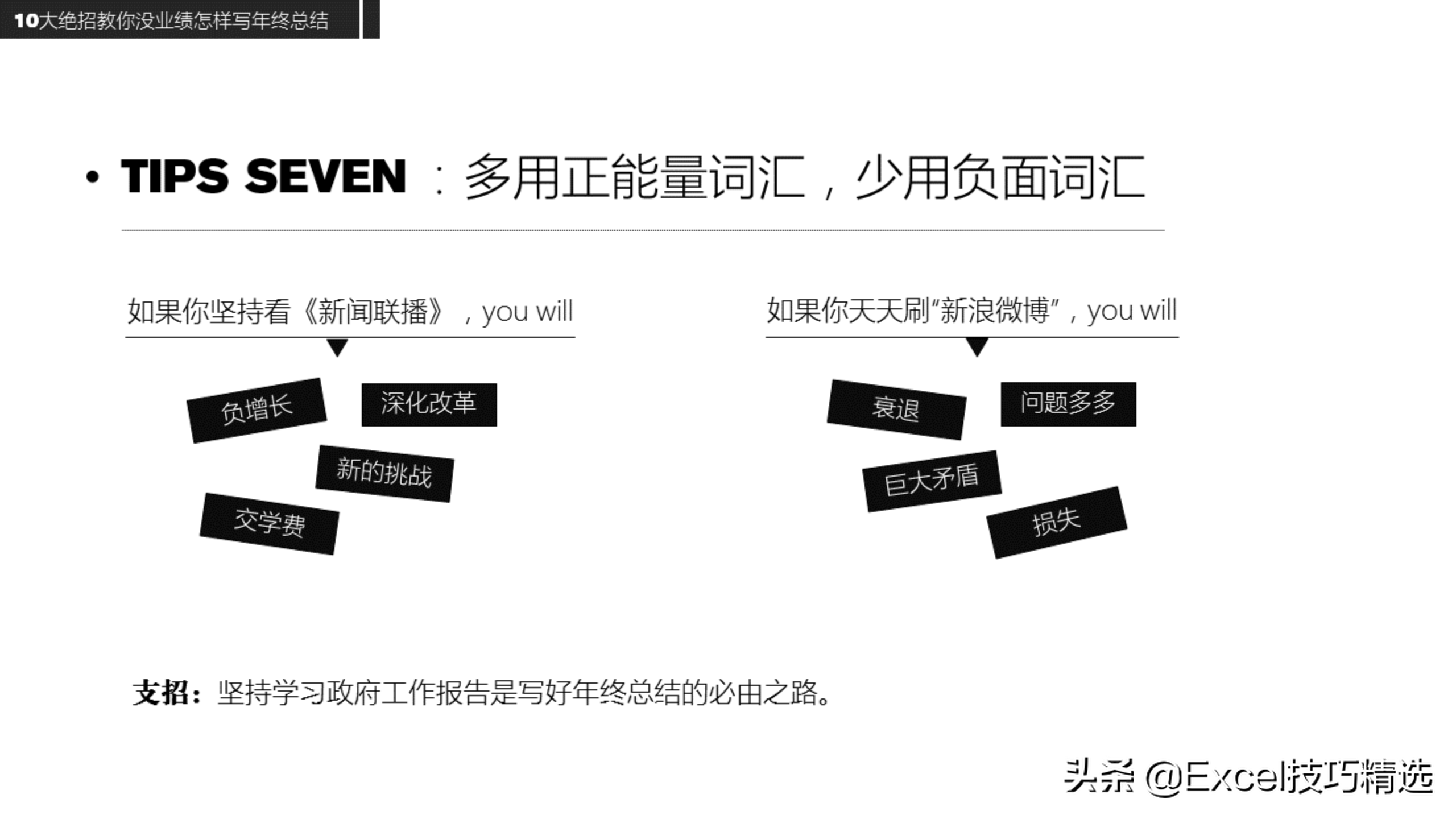 技巧:多用正能量词语,多报报喜;