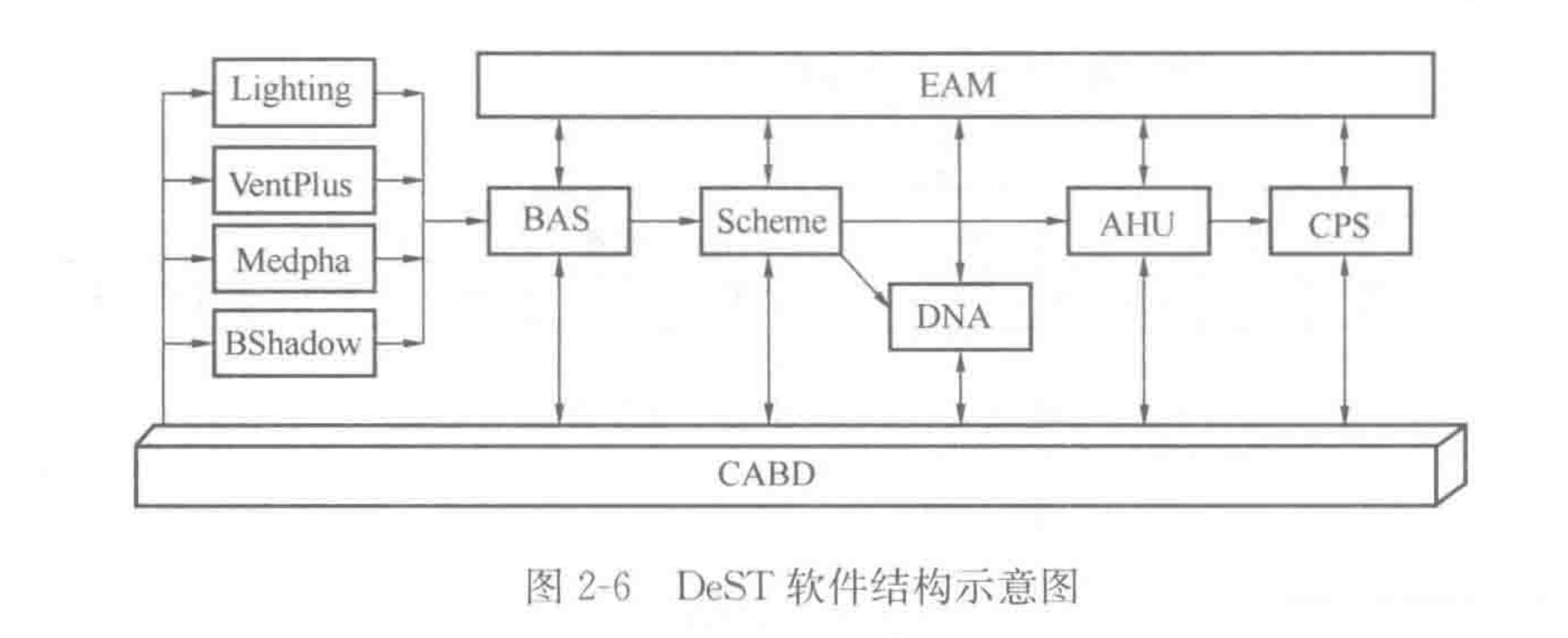Scheme为空调系统方案模拟模块,可以进行方案的设计和设备的选择。DNA是DeST中机械通风系统分析模块,机械通风系统模拟可完成风系统设计计算和校核计算。AHU是设备校核模拟模块,其目的就是通过模拟手段对设计者提出的空气处理方案进行全年校核,为设计人员的方案提供量化的比较依据。CPS是冷热源系统与水系统的方案设计模块,通过模拟手段对方案进行量化的模拟分析,为设计人员提供比较不同方案的依据。EAM为经济性评价模块,包括方案设计阶段、初步设计阶段、施工图设计阶段、设计后的经济评价四个阶段。