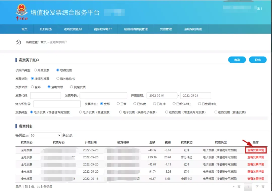 在发票类子账户中,搜索取得的发票,可看到金税系统推送的全电发票,按照开票日期选择,可查询收到的全电发票,再对查询的发票进行导出。