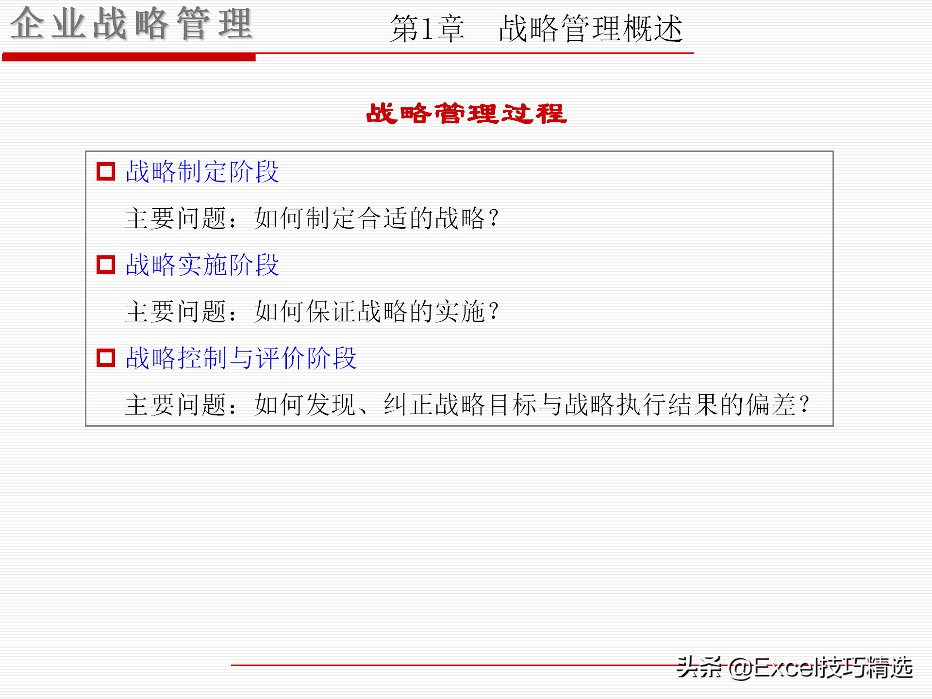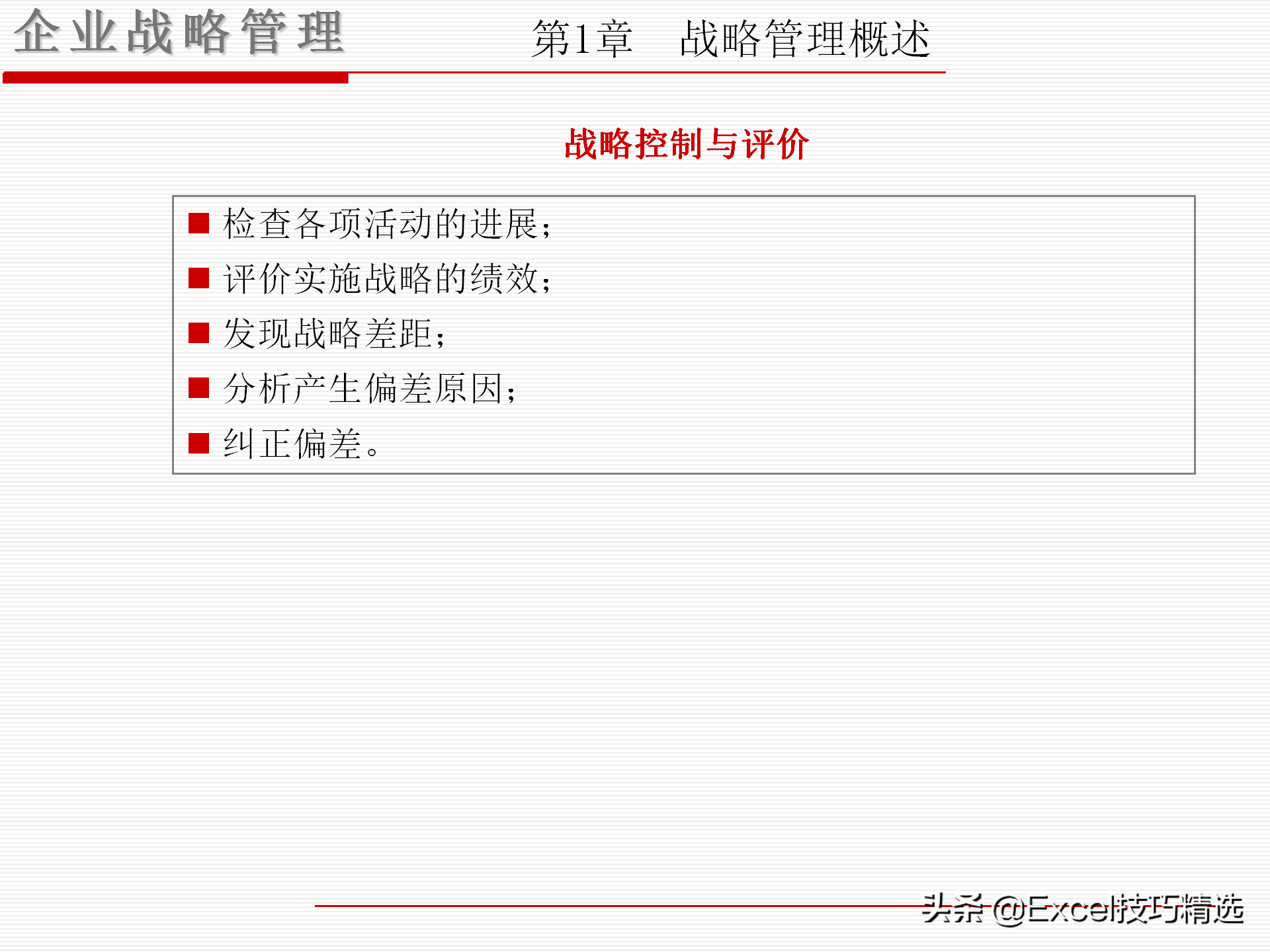 战略控制与评价阶段:如何发现、纠正战略目标与战略执行结果的偏差?包括,检查各项活动的进展;评价实施战略的绩效;发现战略差距;分析产生偏差原因;纠正偏差。