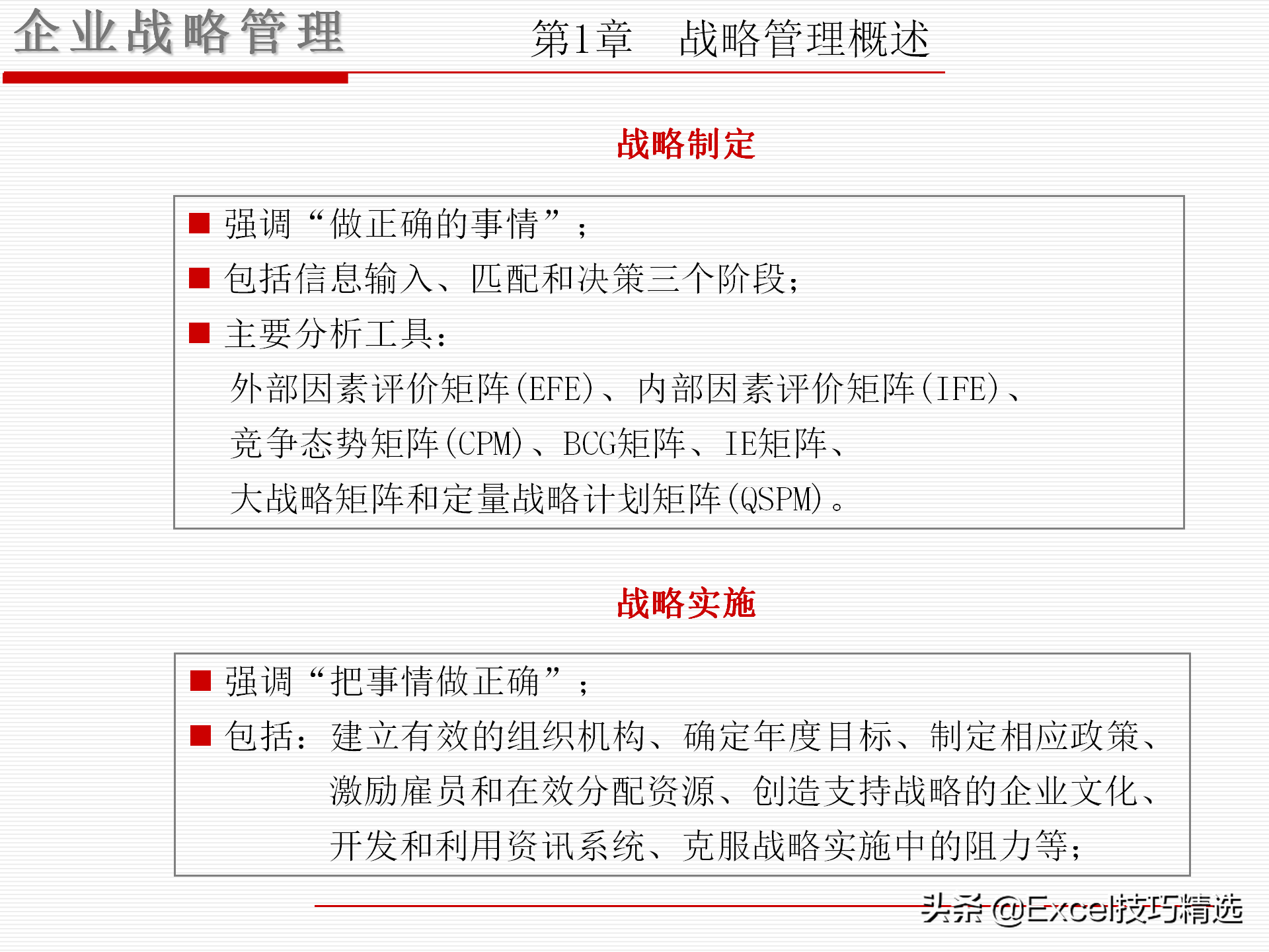 战略制定阶段:如何制定合适的战略?强调“做正确的事情”,常用的工具有,外部因素评价矩阵(EFE)、内部因素评价矩阵(IFE)、竞争态势矩阵(CPM)、BCG矩阵、IE矩阵、大战略矩阵和定量战略计划矩阵(QSPM);