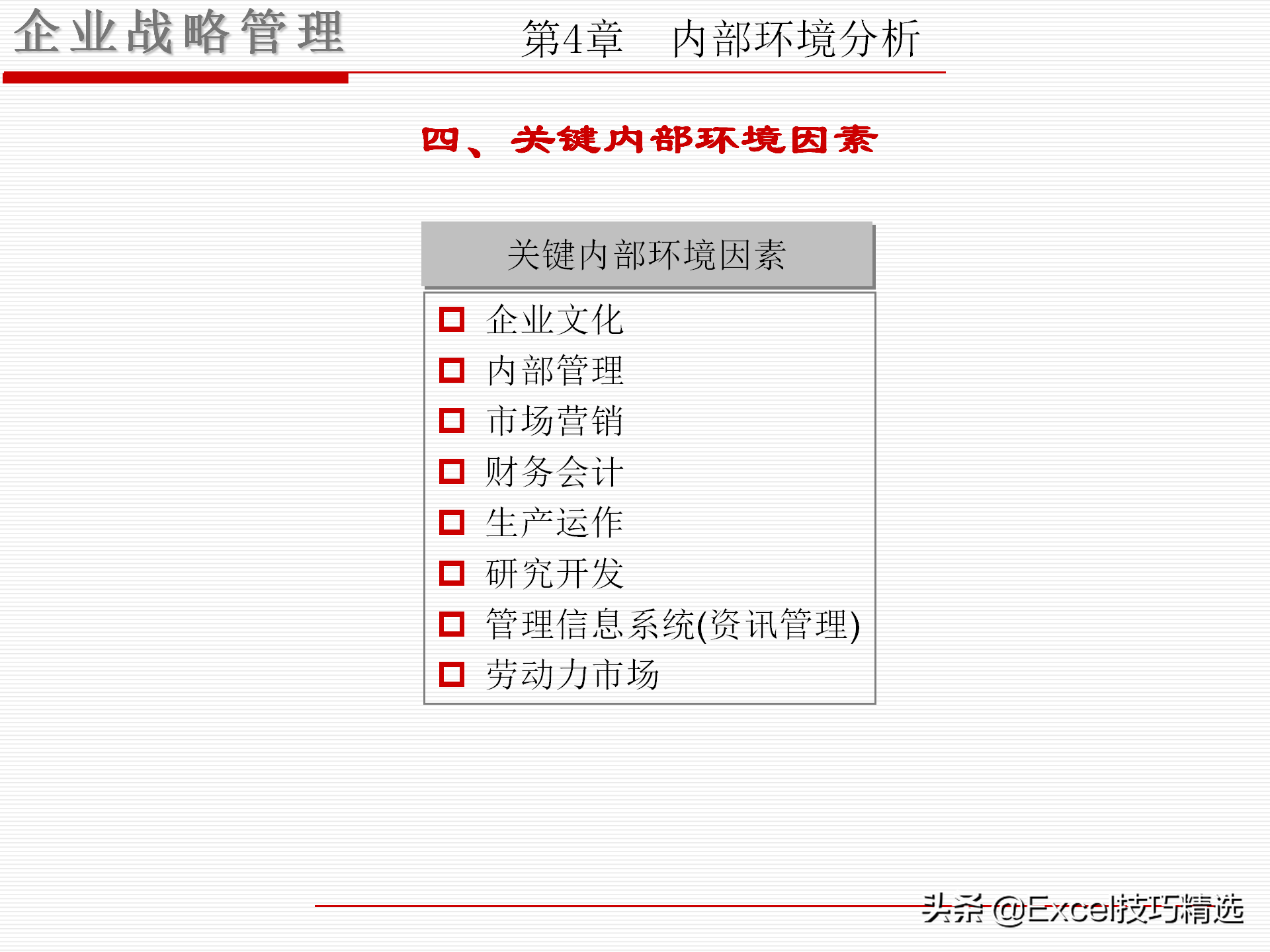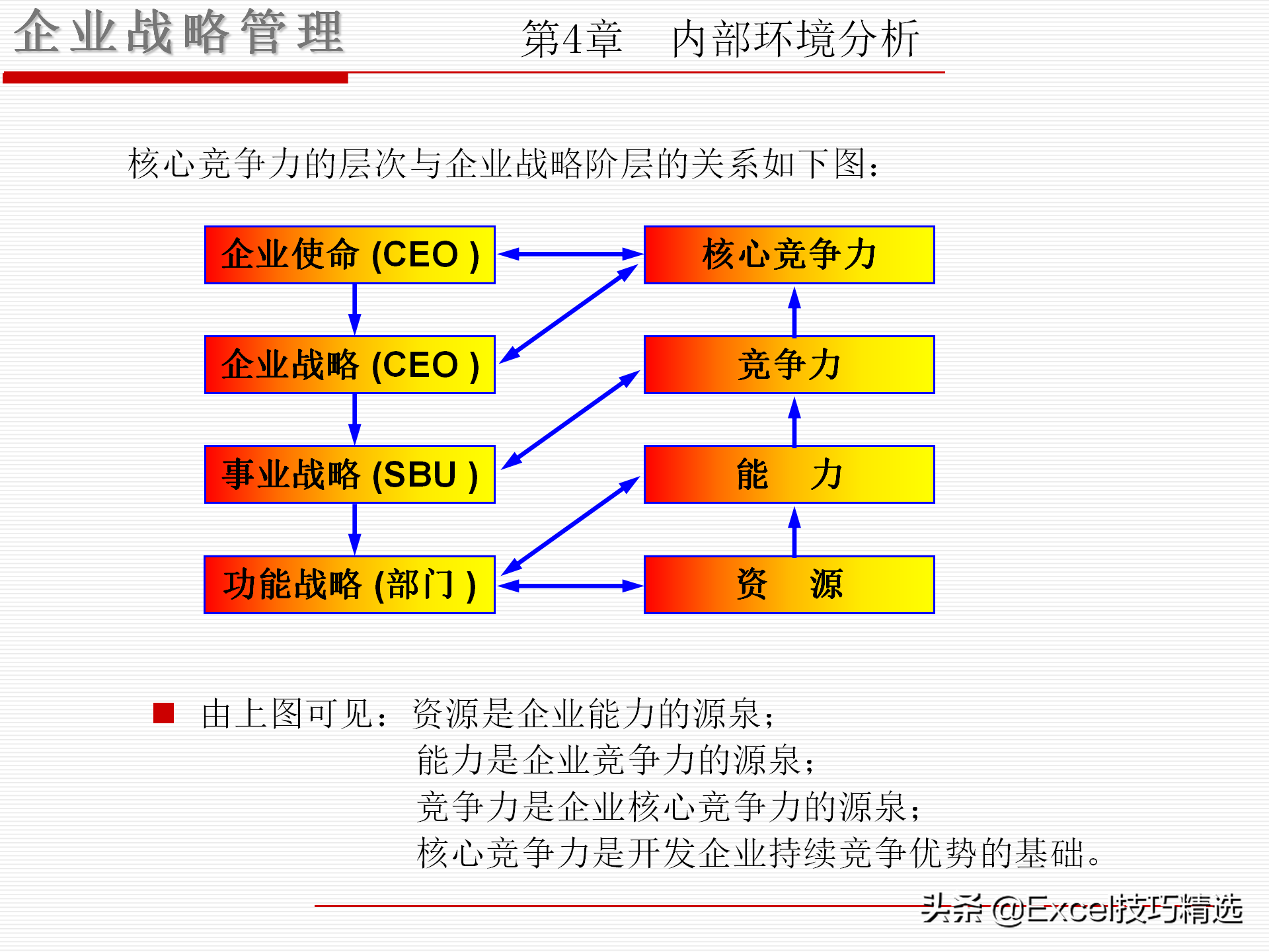 4个关键词:愿景与使命、外部机会与威胁、内部优势与劣势、竞争优势;