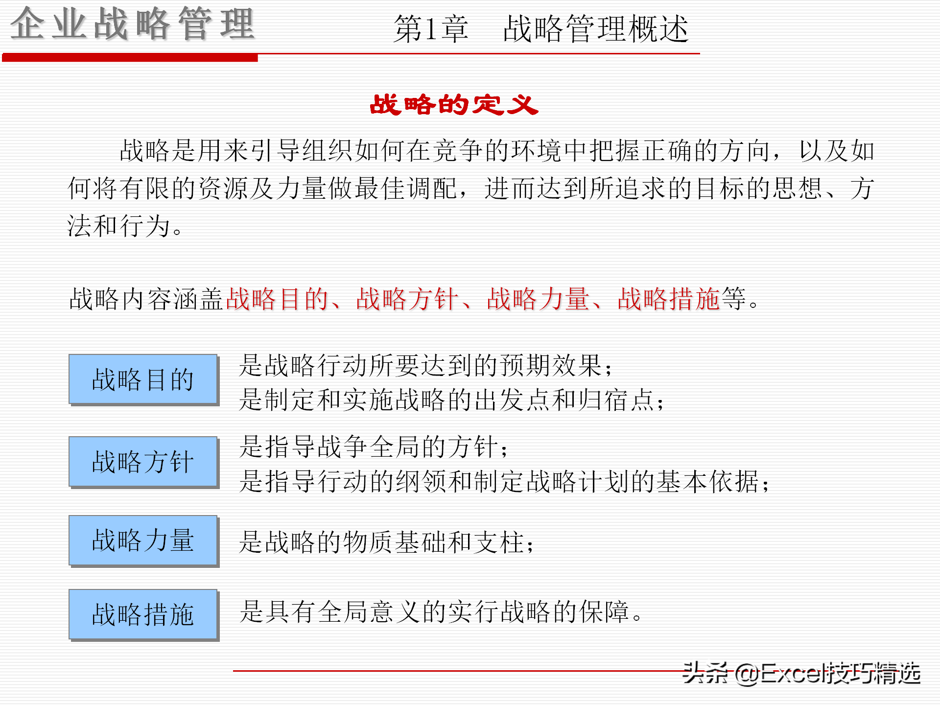 战略,是引导组织在激烈竞争环境中,把握正确的方向、最佳配置资源与力量,进而达成目标的方法和行为。战略涵盖了4项内容: