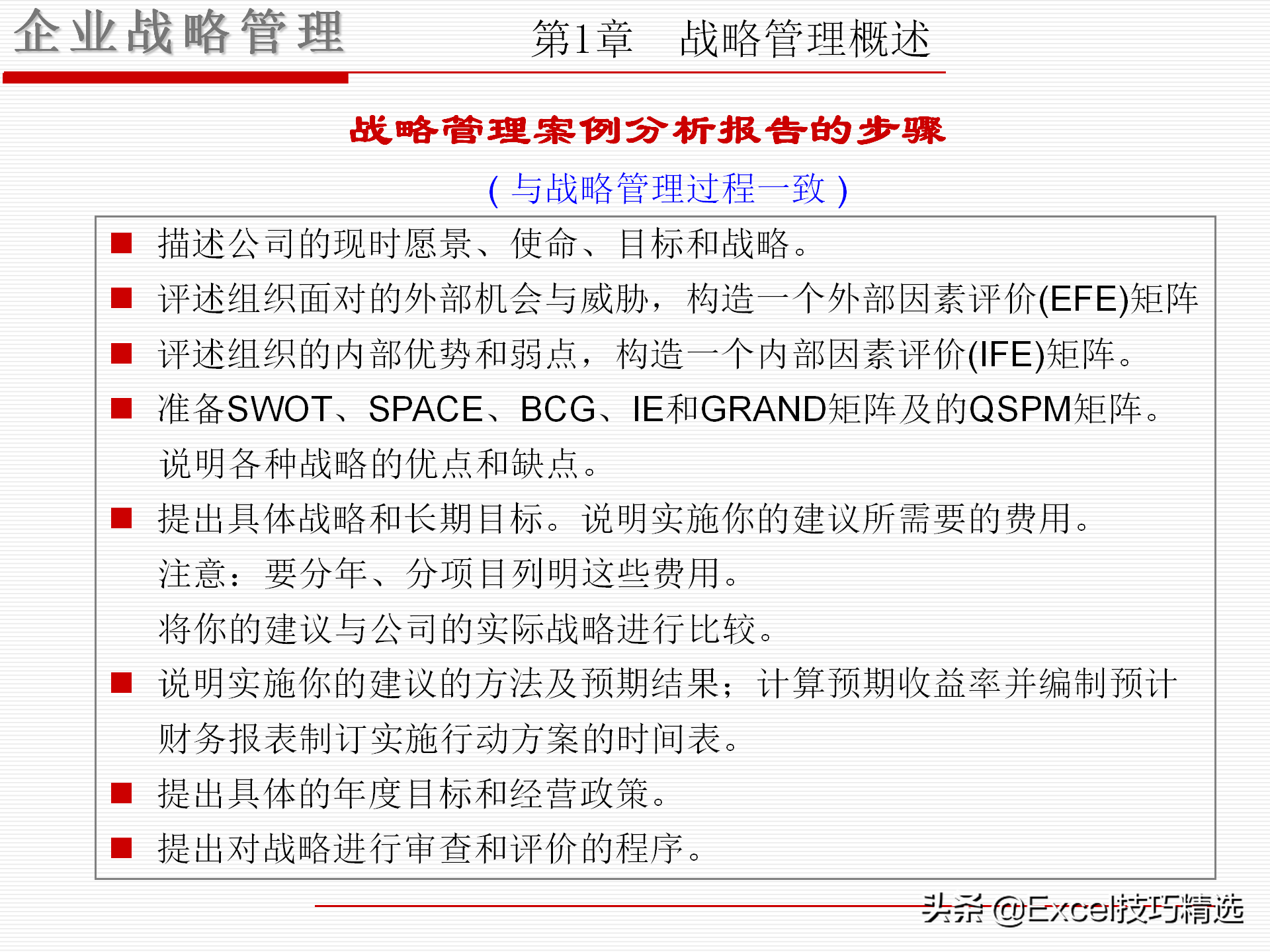 8个步骤:描述愿景、使命、目标、战略,评述外部机会与威胁,评述内部的优势和劣势,说明各种战略的优缺点,提出具体战略和长期目标,说明实施方法与预期结果,提出年度目标与经营政策,提出战略审查与评价程序。