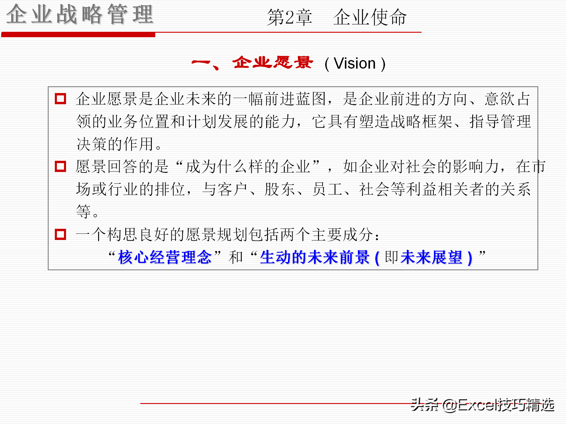 愿景与使命:愿景,是要成为什么样的企业;使命,是该如何做,才能实现愿景;