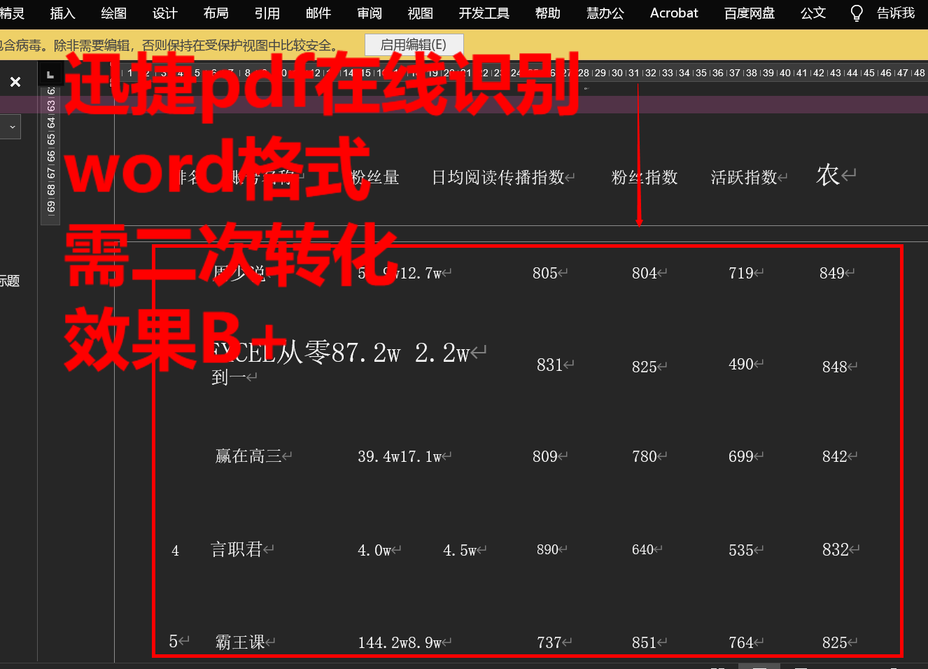 2.效果最好的是迅捷pdf在线转换(终生会员版),但依然需要进行手动调整,部分识别错误、错位。