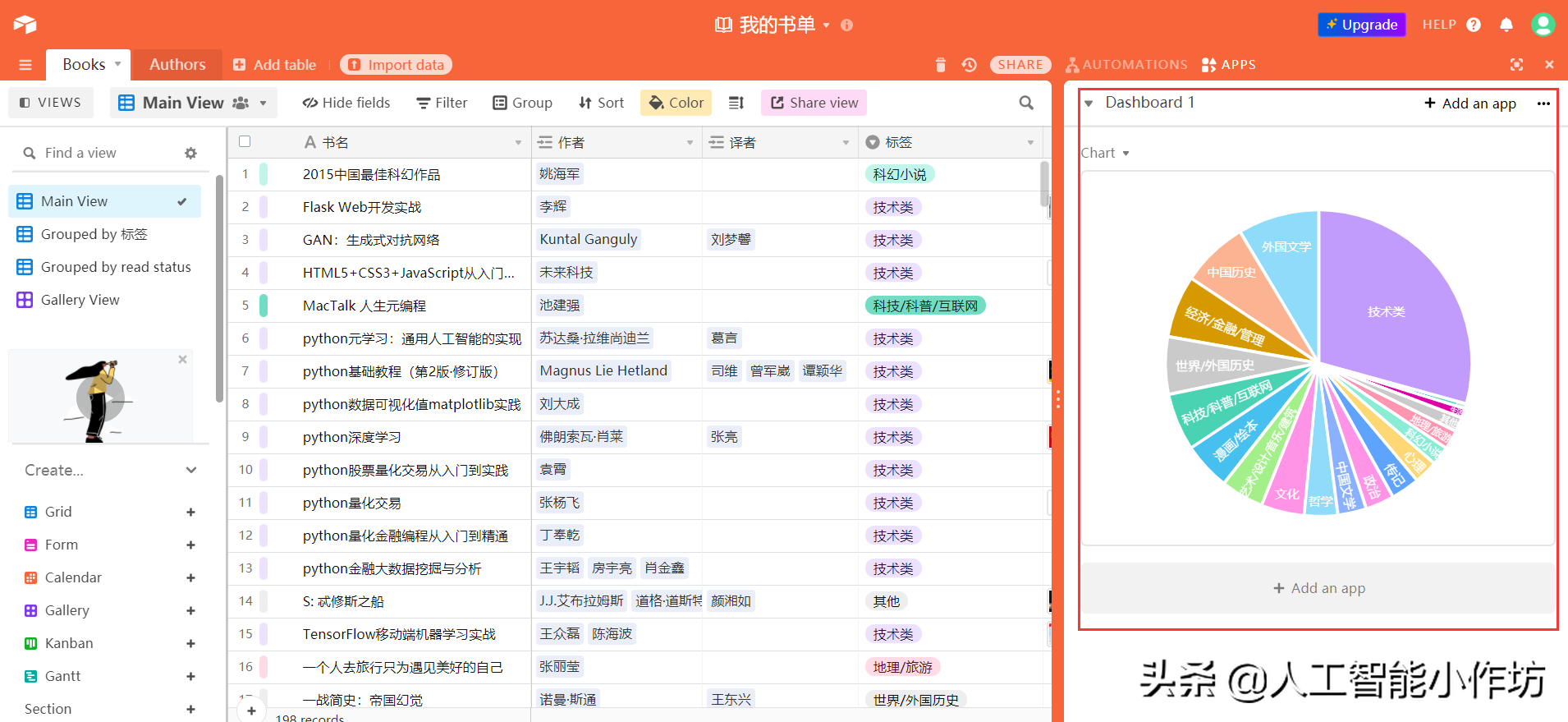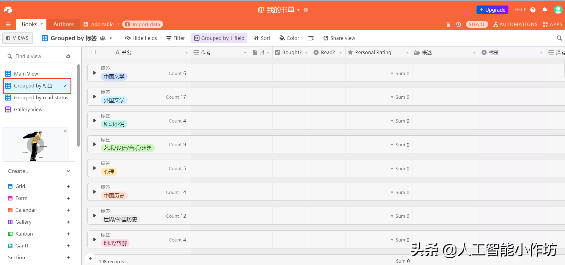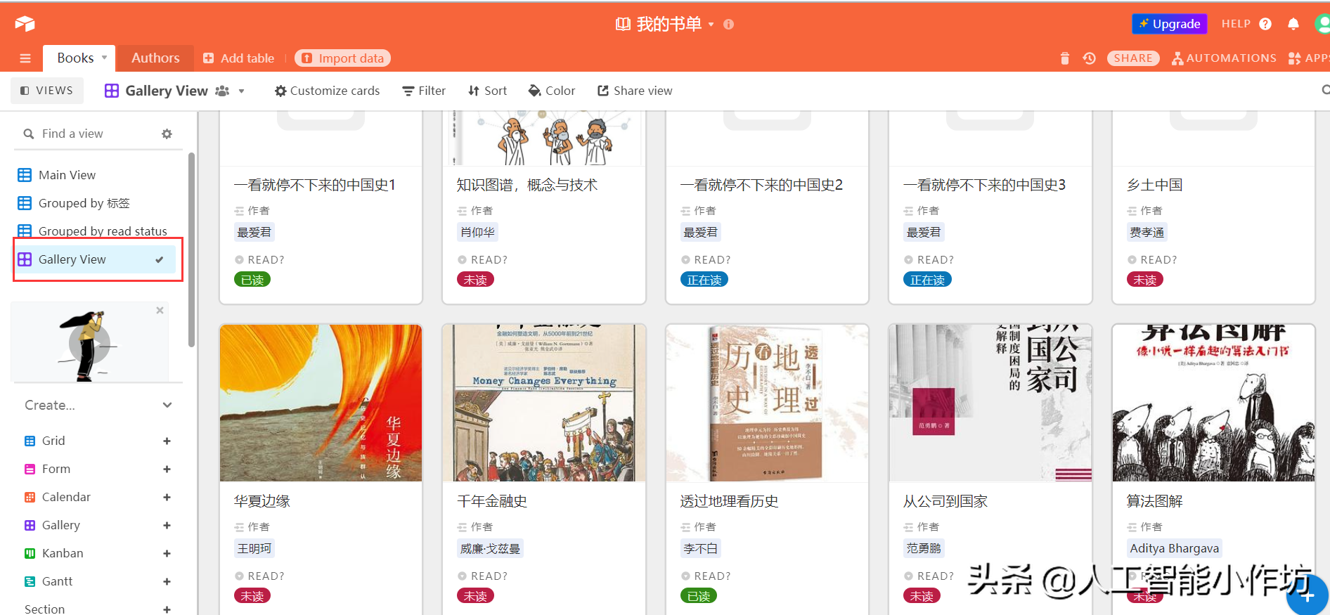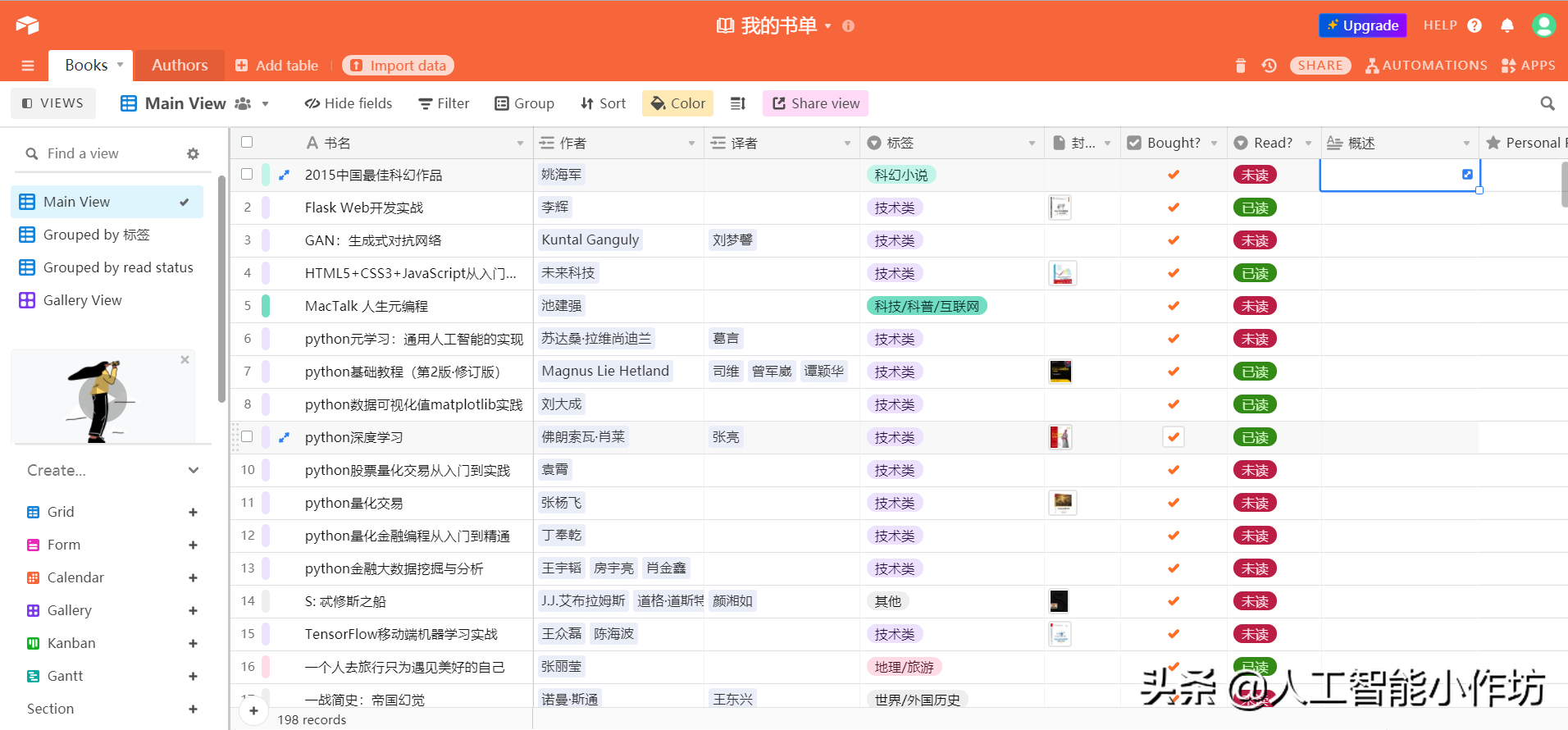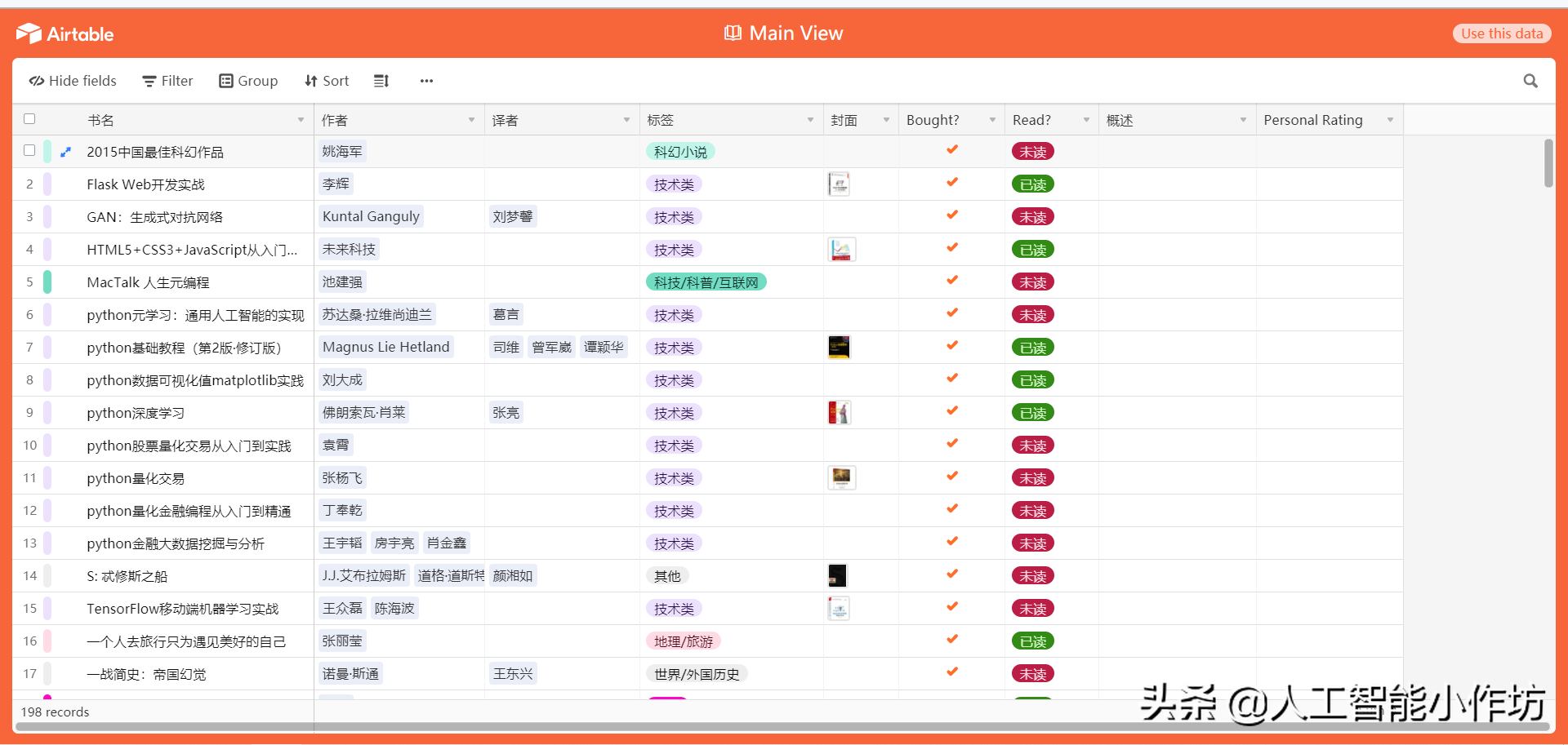 最近在整理这几年买的书,图1是我这几年全部的家当了[笑哭]这么多书不仅搬家累,如何记录、管理也是问题。一直希望找到一个平台能专门管理图书,直到找到了airtable(网址网页链接),真是个神器。