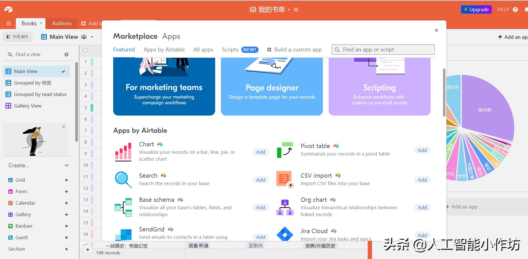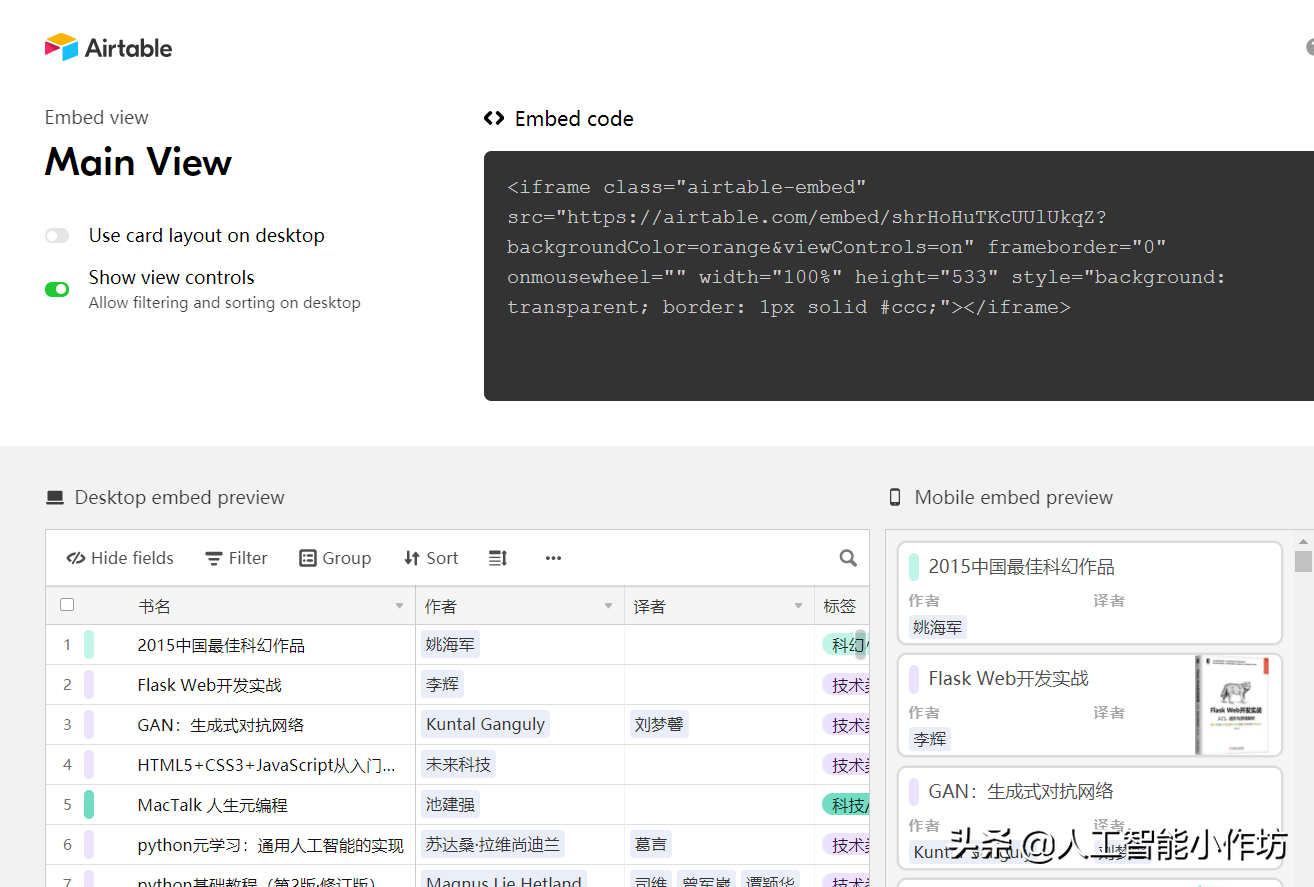 如图1,基本的用法就是建立一个表格,作为个人资源库。虽然这样的表格excel可以做,但比较费劲,而且airtable操作更简洁、更美观、功能更强大。图2是主视图,你可以添加某列的groupby视图(图3),可以进入瀑布流视图(图4),可以导出csv,添加各种app(图5、图6,比如图6的图表),分享链接他人看的也很漂亮(图7),还可以多人协作。也可以导出html嵌入代码,将它显示在自己的网站上(图8)。airtable当然不止于整理图书这么简单的工作,官网提供了很多模板(图9)。