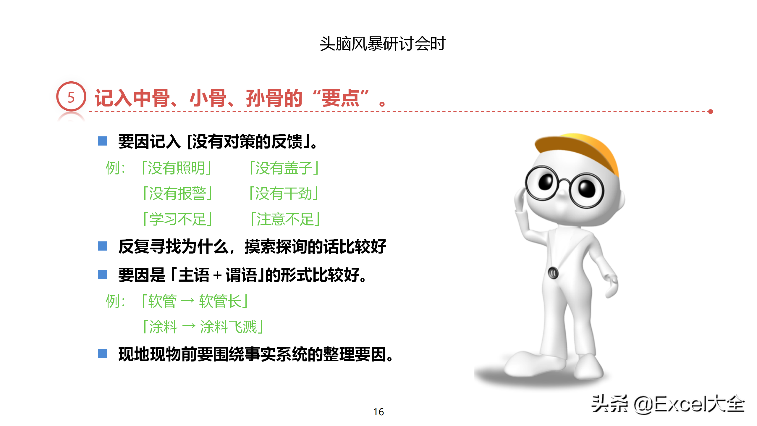 大骨:确定问题的分析方向,也就是思考问题的维度,比如,常用的6M法,就是从6个维度(人、机、物、环、法、料、测)分析问题。分析原因可以采用头脑风暴法,尽可能罗列各自维度上的原因;