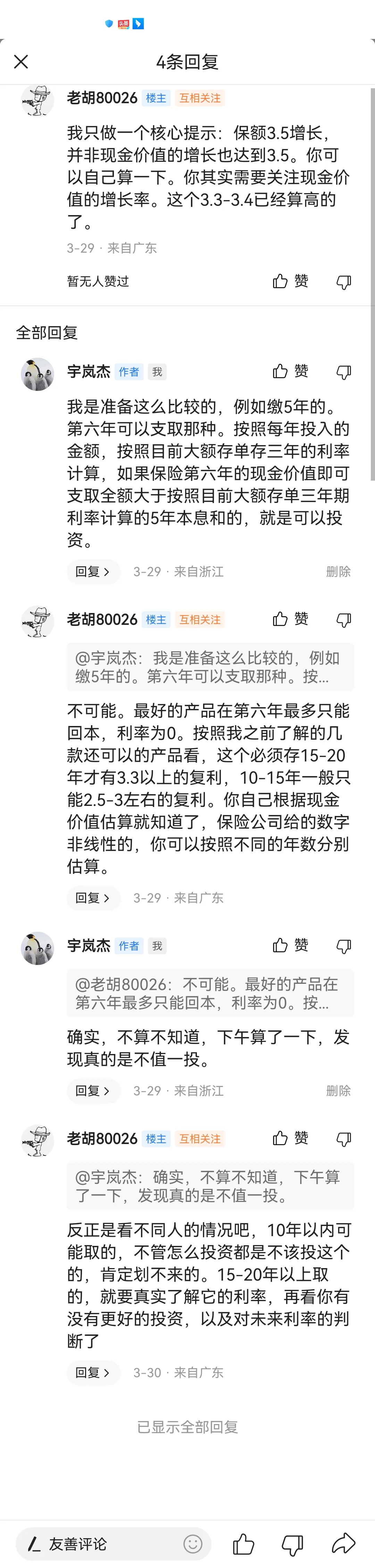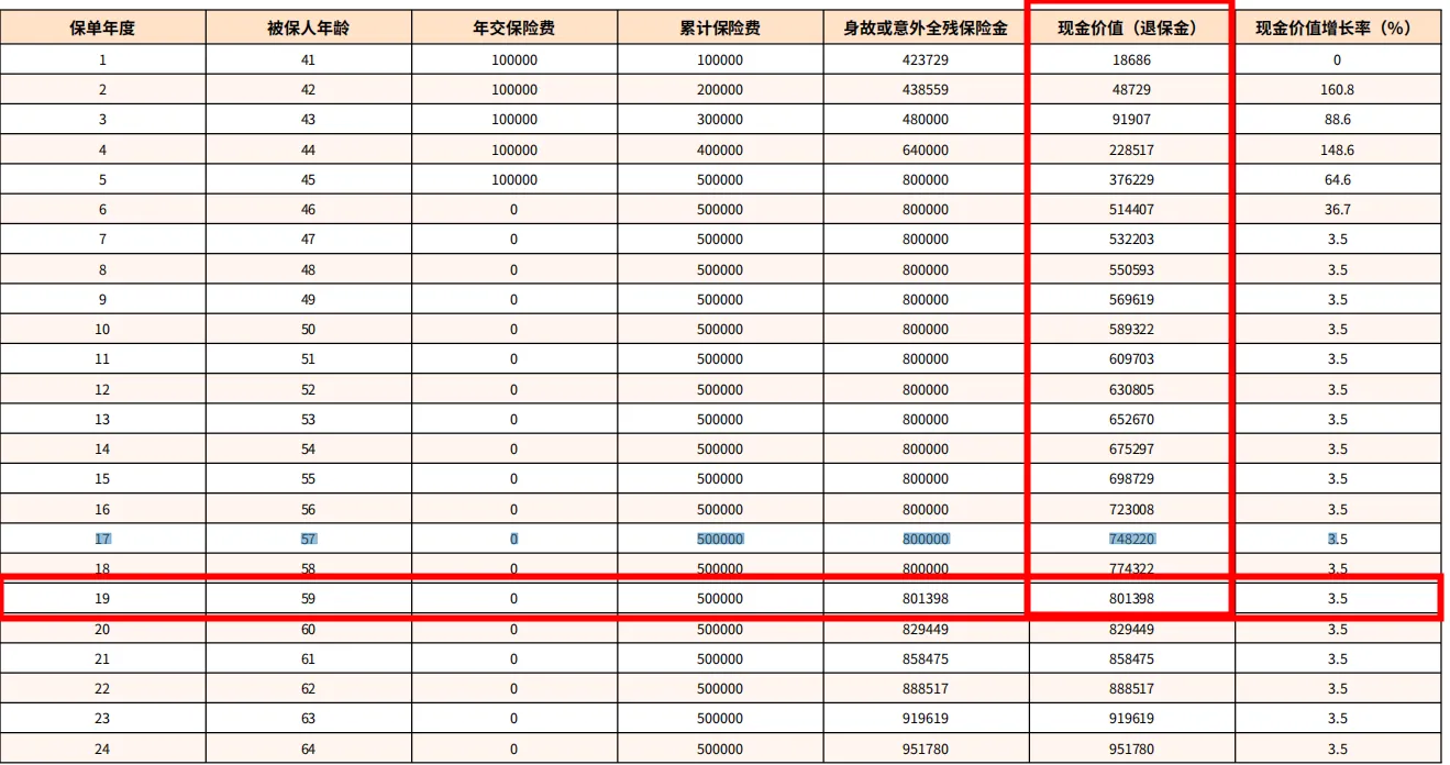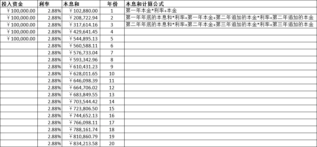 帖子一发,果真来了好多人,其中有两个我想特别提一下。一个是吐槽我懒或者说笨的,连研究保险条款都懒得研究。我无力回怼,因为保险条款真是太多,我确实没耐心一条一条看,我觉得如果我买这个产品,主要不是为了以后身故或者全残后的理赔,其实只是想做个资产保值或者适当增值。我只需关注利率和追加支取这三个内容。当然也正是因为这个兄台的直言不讳,所以,我虽然没有仔细去研究保险条款,但是我拉了一个excel表格,然后用我现在买的活期理财的利率来每年存取一次,头五年每年追加10万,然后把六年以后可得的本息额和保险公司给的数据进行比较,看看差距是怎样的。我用的是2.88%的利率,因为我现在买的活期理财利率大概在2.88左右。可是计算后发现貌似保险公司的那个增额险实际收益是就算持有近20年,也才和2.88%的活期收益差不多。收益这么低,但是为此我的资金却要被绑20年。当然也许以后活期收益还是会继续下行,可是实际上,我们的资金除了买风险最低的活期理财,我们还可以买大额存款,利率也在3以上,如果再适当投一些资管和信托产品,定期理财,就算偶尔市场有波动,我相信长期综合收益肯定是远大于买这个增额终身寿险的。而且资金在自己手上,是有灵活性的。从这个产品吸引我的最开始的点,投资收益来看,其实它并不是适合我的理想产品。我的计算表格和保险公司给的表格我都附上了。大家可以大概看看了解一下。
