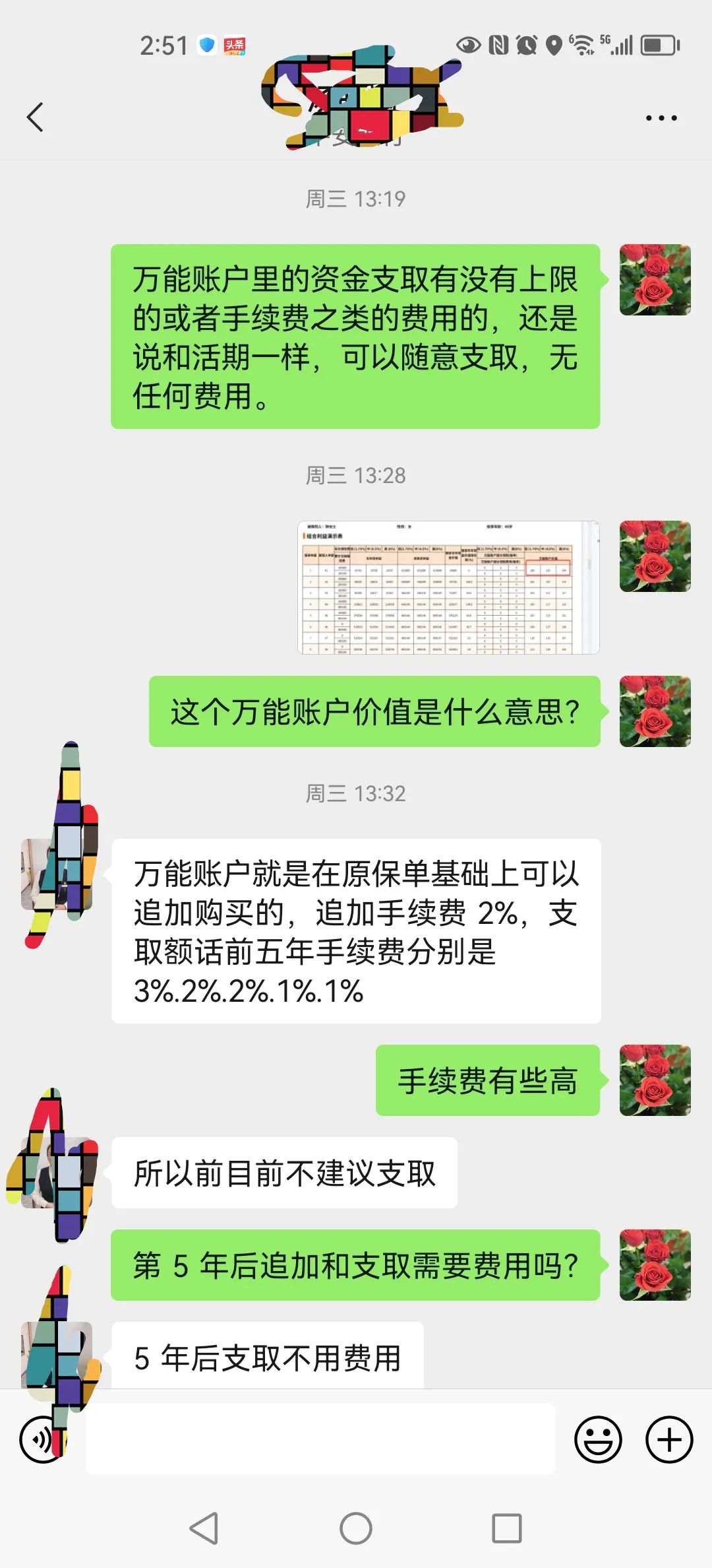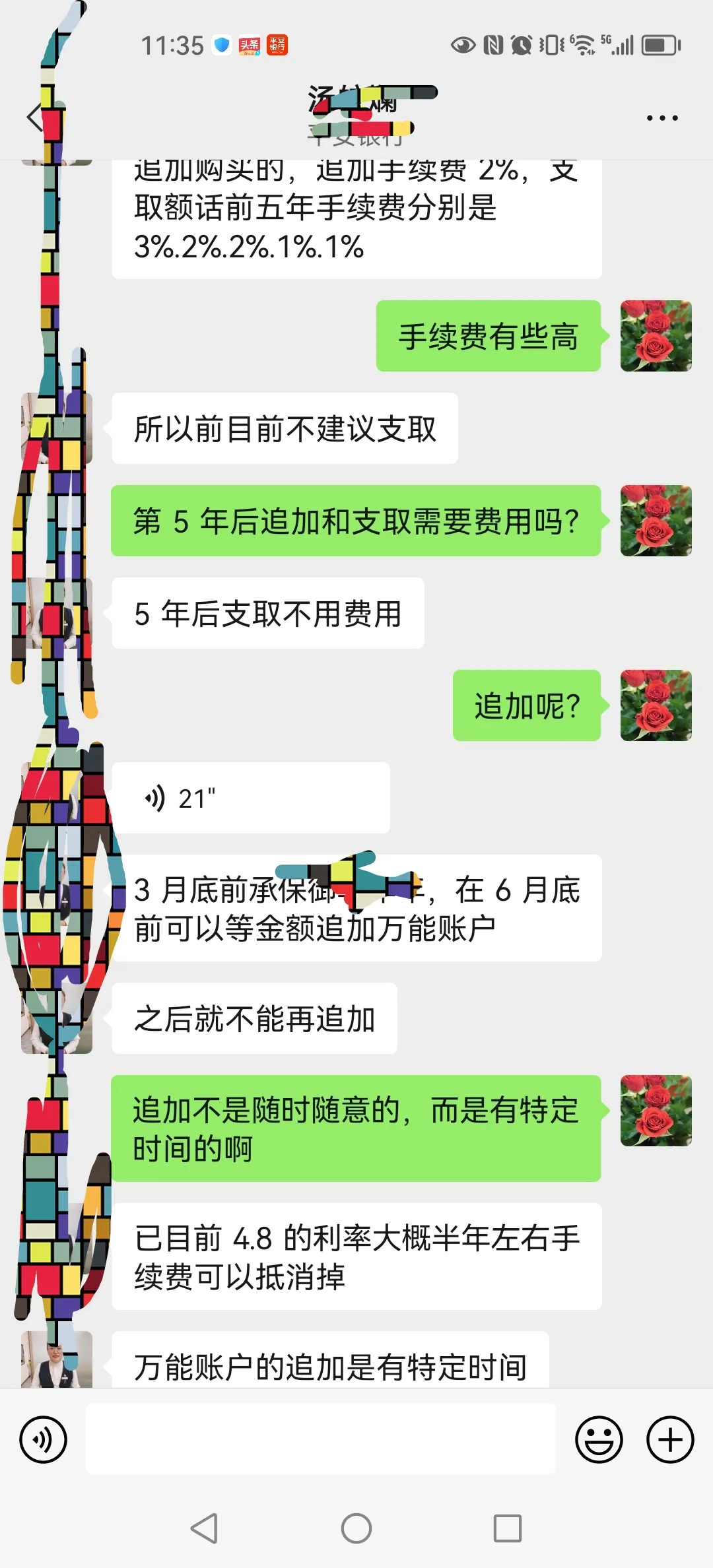 另外对于我之前帖子里提到的这个保险配置的万能账户,客户经理最开始说每年只能支取20%或者全额退保,我以为是可随时支取且无手续费,因为那天我问客户经理的时候,她和她同事并没有正面回复我这个问题,让我以为是可以随时追加和支取万能账户里的资金且无任何费用的,但是经网友提醒,我又特地和客户经理确认了,追加有时限,且一定时间段内追加和支取都是有手续费的。虽说目前有4.8的收益,但是扣除手续费,瞬间不香了。